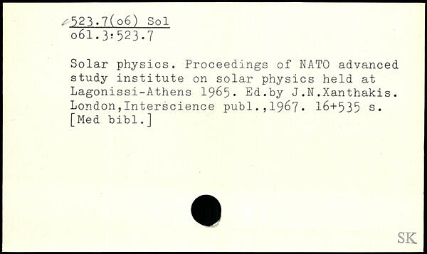 Solar physics. Proceedings of NATO advanced study institute on solar physics held at Lagonissi-Athens 1965. Ed.by J.N.Xanthakis.