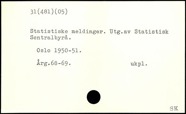Statistiske meldinger, Utg.av Statistisk Sentralbyrå. Oslo 1950-51. Årg.68-69. ukpl.