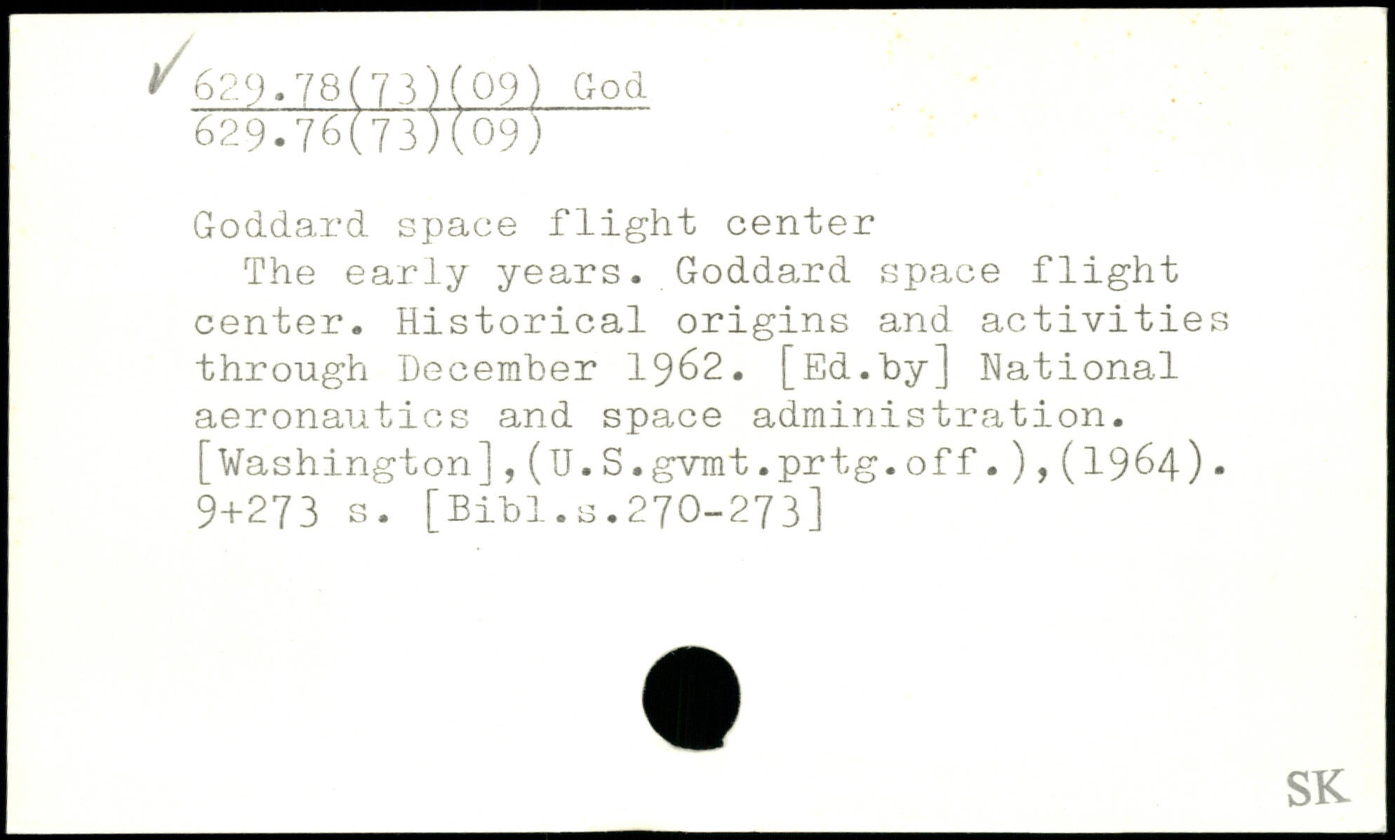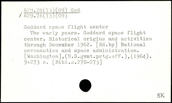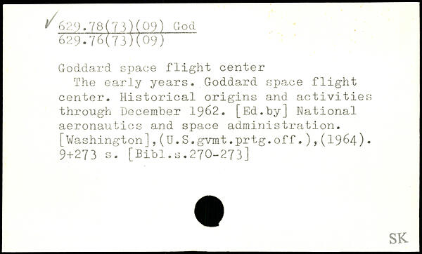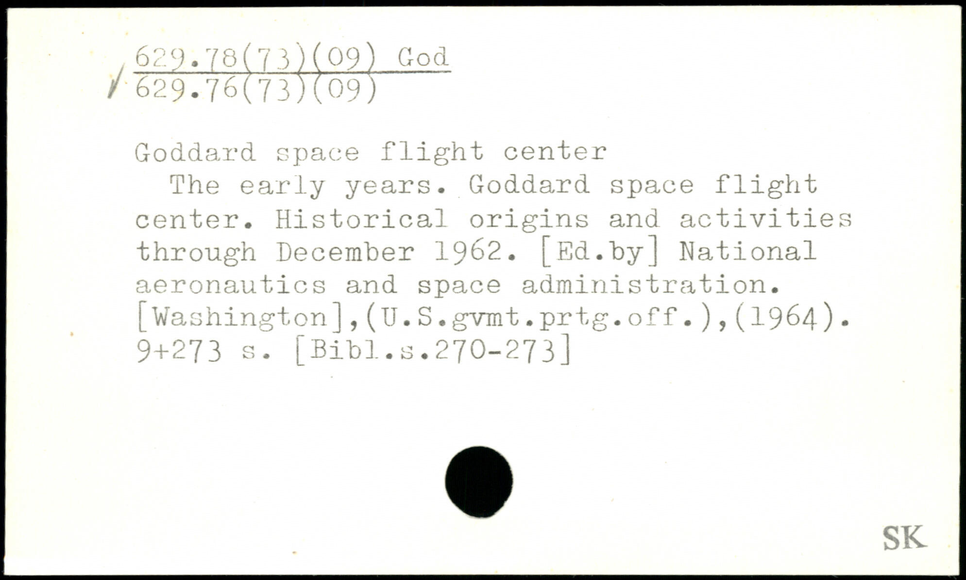 Goddard space flight center The early years. Goddard space flight center. Historical origins and activities through December 1^62. [Ed.by] National aeronautics and space administration. [Washington],(U.S.gvmt.prtg.off.),(1964).