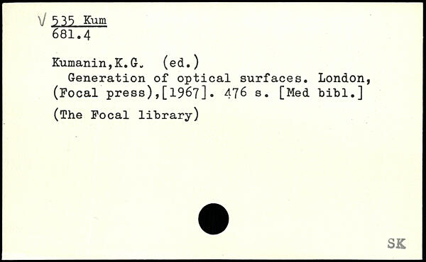 Kumanin,K.G, (ed.) Generation of optical surfaces. London, (Focal press),[1967].