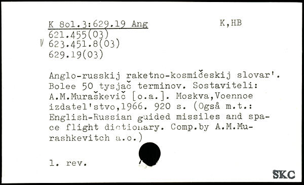 Anglo-russkij raketno-kosmideskij slovar’. Bolee 50 tysjac terminov. Sostaviteli: A.M.Muraskevic [o.a.]. Moskva,Voennoe izdatel?stvo,1966.