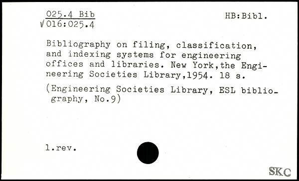 Bibliography on filing, classification, and indexing systems for engineering offices and libraries. New York,the Engineering Societies Library,1954.