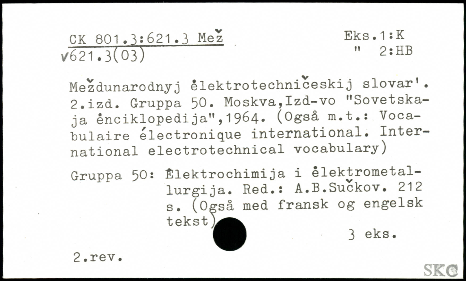 Mezdunarodnyj élektrotechniceskij slovar1. 2.izd. Gruppa 50. Moskva,Izd-vo "Sovetska-ja énciklopedija",1964. (Også m.t.: Voca-bulaire electronique international. Inter— national electrotechnical vocabulary) Gruppa 50: Elektrochimija i élektrometallur gi ja. Red.: A.B.Suckov.