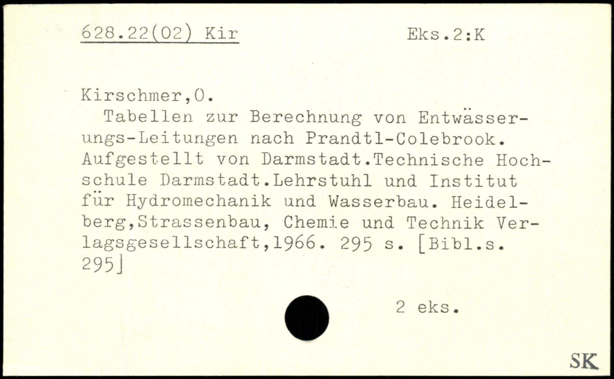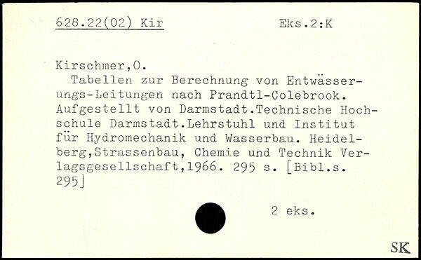 Tabellen zur Berechnung von Entwässerungs-Leitungen nach Prandt1-Colebrook. Aufgestellt von Darmstadt.Technische Hochschule Darmstadt.Lehrstuhl und Institut für Hydromechanik und Wasserbau. Heidelberg, Strassenbau , Chemie und Technik Ver-lagsgese'llschaf t,1966.