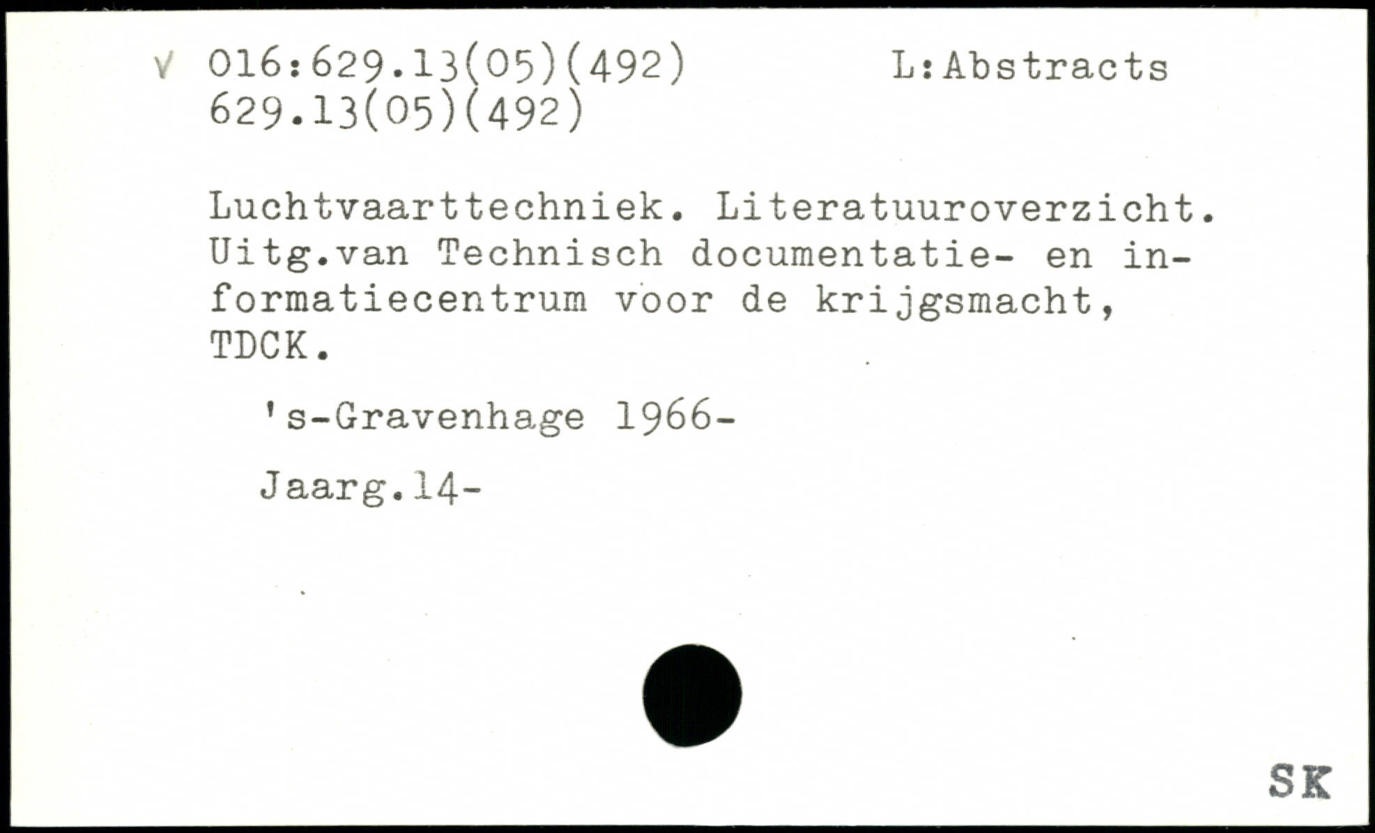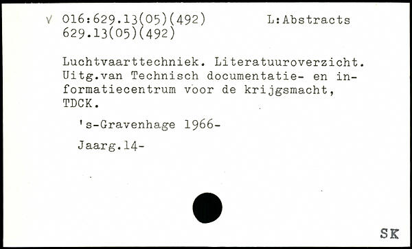 Luchtvaarttechniek. Literatuuroverzicht. Uitg.van Technisch documentatie- en in-formatiecentrum voor de krijgsmacht, TDCK. 's-Gravenhage 1966-Jaarg.14-