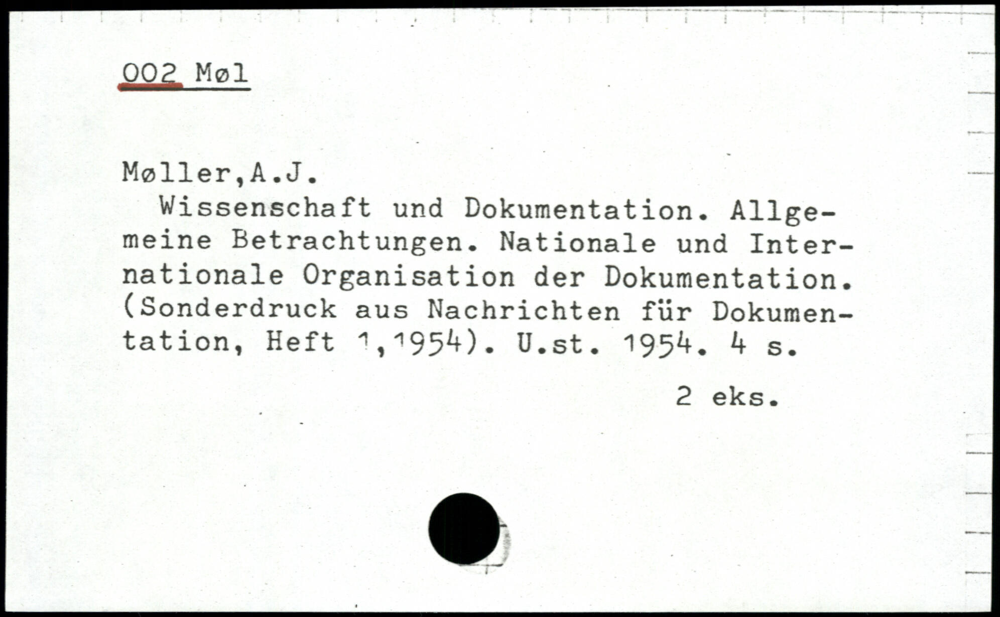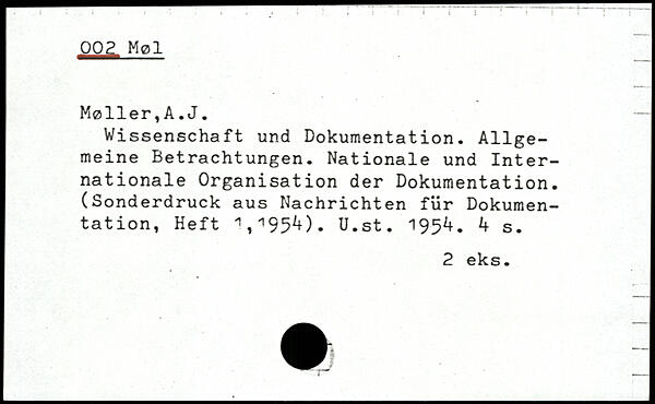 Wissenschaft und Dokumentation. Allgemeine Betrachtungen. Nationale und Internationale Organisation der Dokumentation. (Sonderdruck aus Nachrichten für Dokumentation, Heft 1,195.0. U.st. I95^f. s.