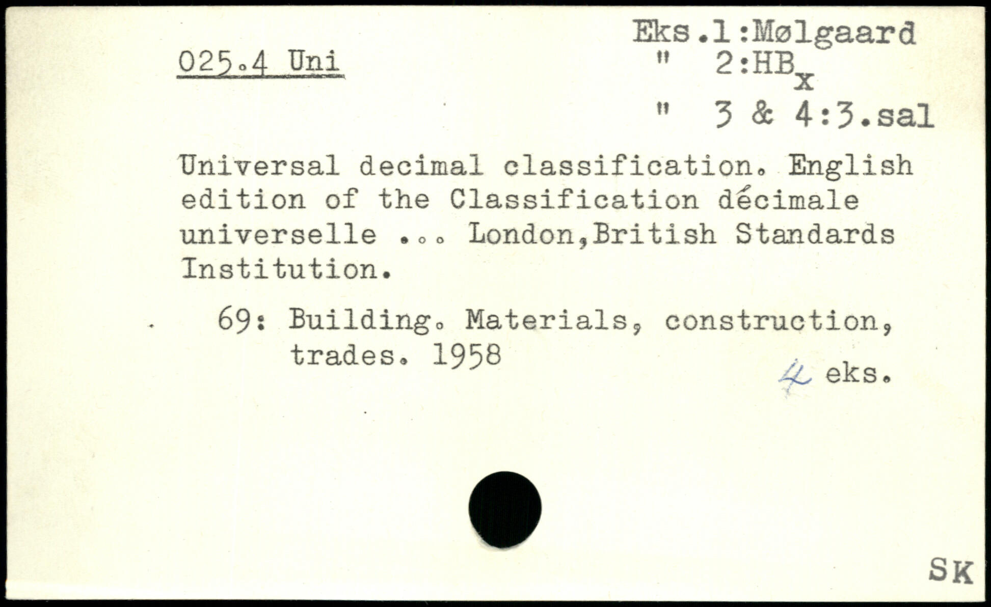 Universal décimal classification, English édition of the Classification décimale universelle .,, London,British Standards Institution. 69: Building, Materials, construction, trade s. 1958 ,■ , 4L eks.
