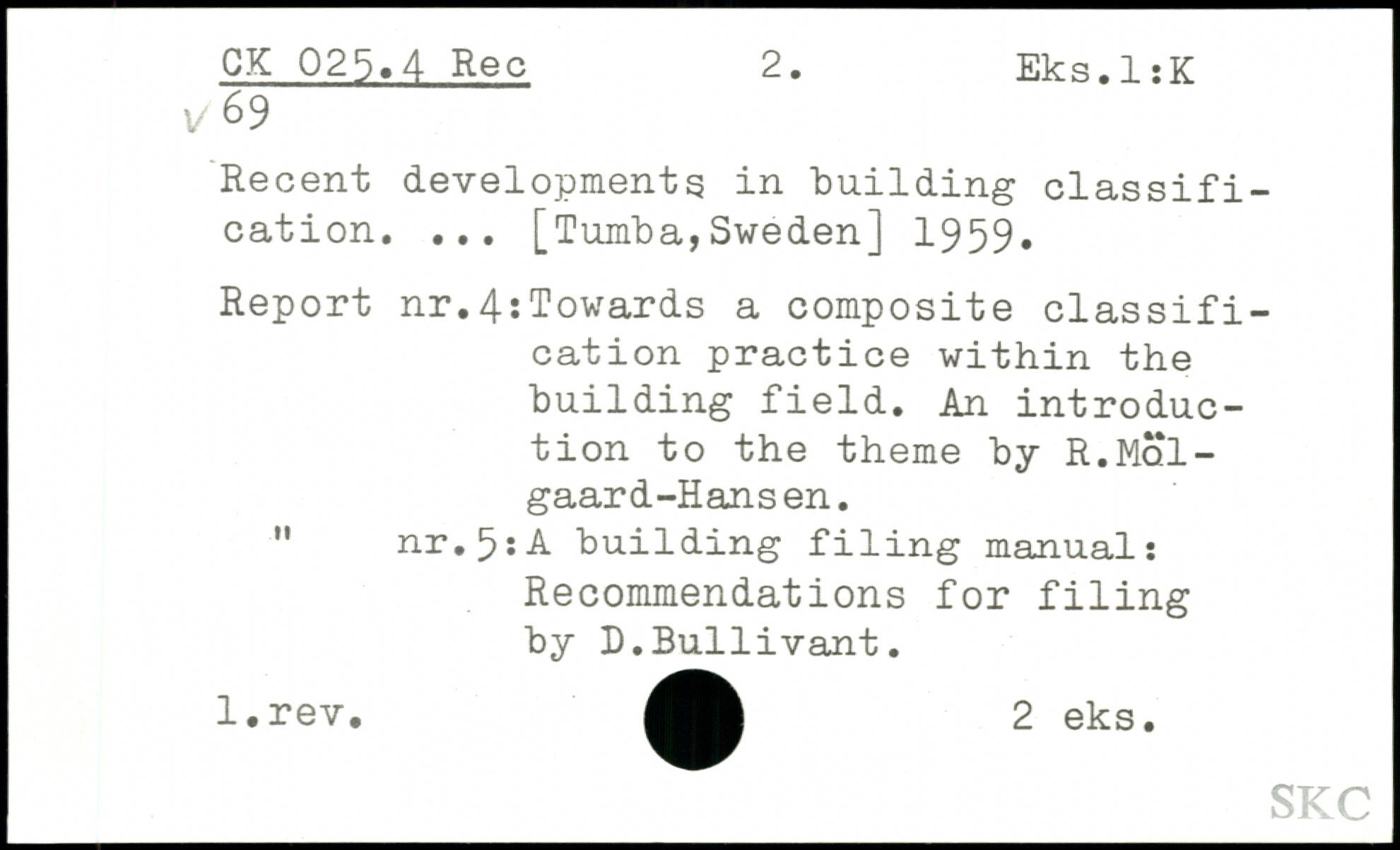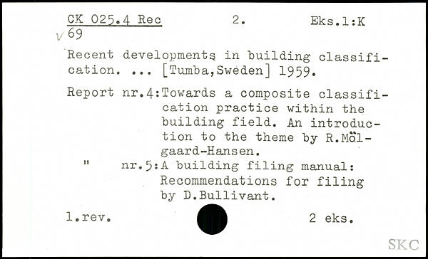 Recent developments in building classification. ... [Tumba,Sweden] 1959. Report nr.4:Towards a composite classification practice within the building field. An introduction to the theme by R.Mol-gaard-Hansen. " nr.5:A building filing manual: Recommendations for filing by D.Bullivant. l.rev. 2 eks.