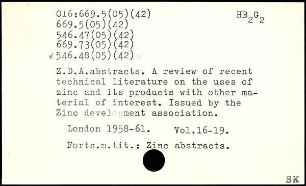 Z.D.A.abstracts. A review of recent technical literature on the uses of zinc and its products with other material of interest. Issued by the Zinc development association.