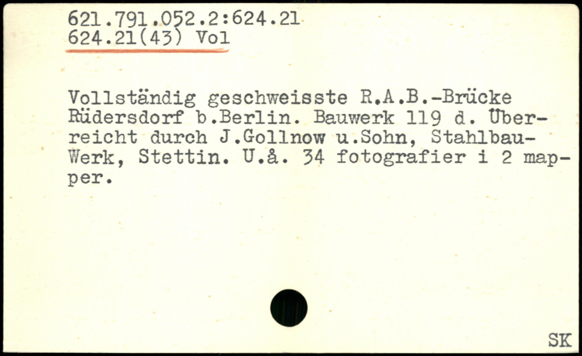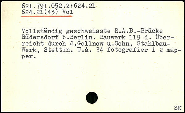 Vollständig geschweisste R.A.B.-Brücke Rüdersdorf b.Berlin. Bauwerk 119 d. Überreicht durch J.Gollnow u.Sohn, Stahlbau-Werk, Stettin. U.ä. 54 fotografier i 2 map-per.