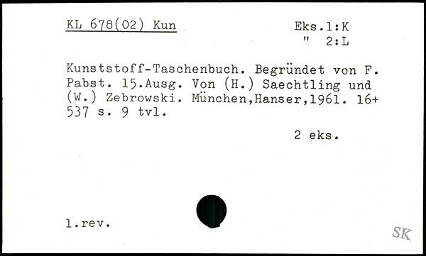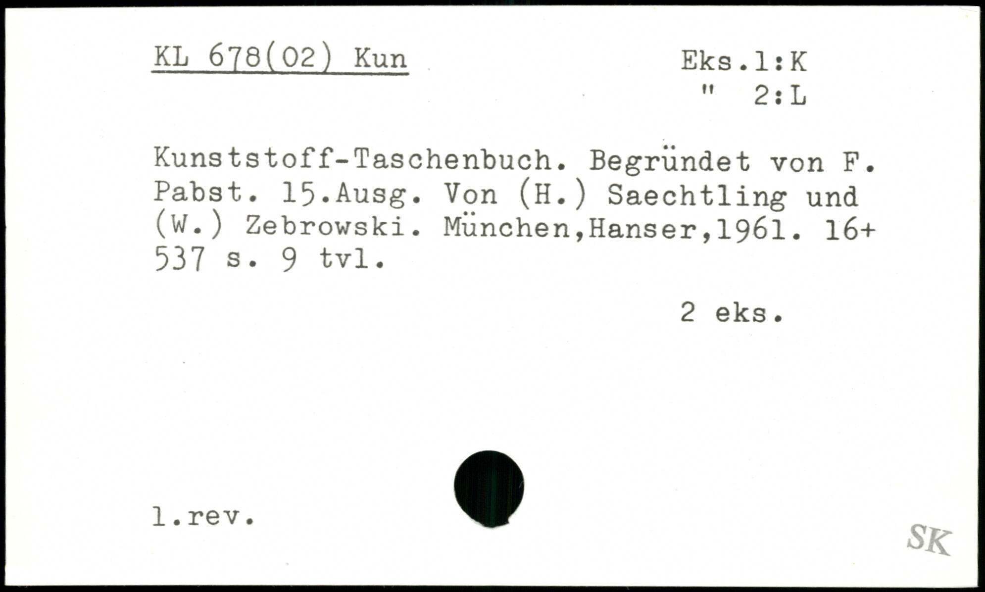 Kunststoff-Taschenbuch. Begründet von F. Pabst. l^.Ausg. Von (H.) Saechtling und (W.) Zebrowski.