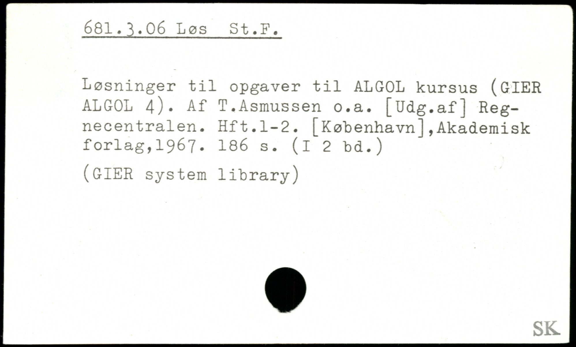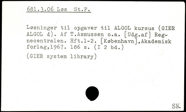 Løsninger til opgaver til ALGOL kursus (GIER ALGOL 4). Af T.Asmussen o.a. [Udg.af] Reg-necentralen. Hft.1-2. [København],Akademisk forlag,1967.