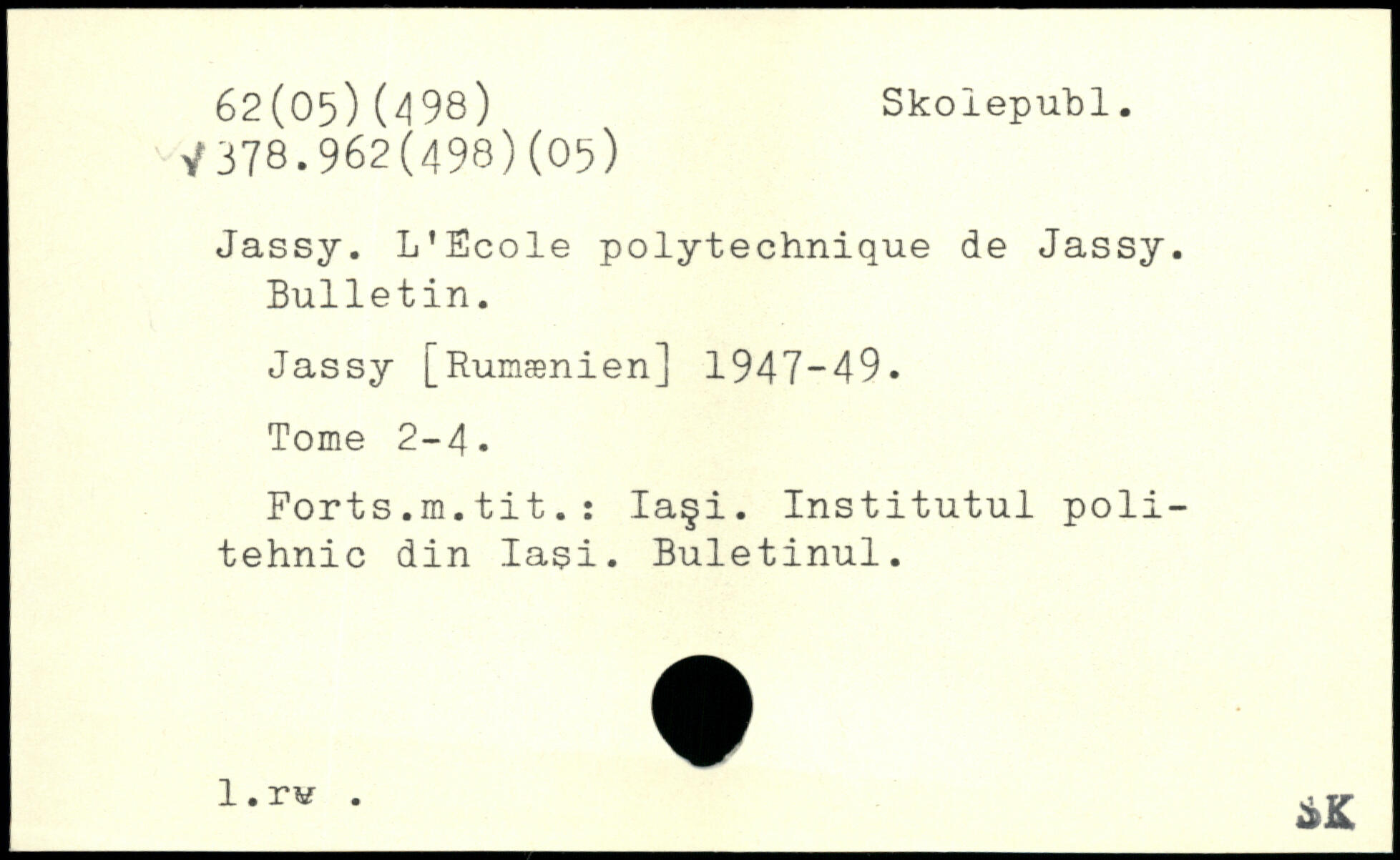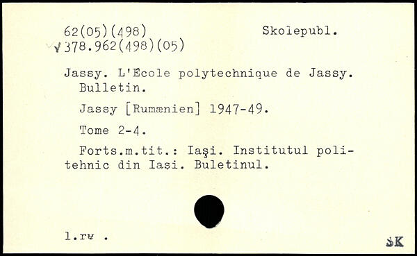 Jassy. L'Ecole polytechnique de Jassy. Bulletin. Jassy [Rumænien] 1947-49. Tome 2-4. Forts.m.tit.: Iaçi. Institutul poli-tehnic din Iasi. Buletinul. x-rK ._AK