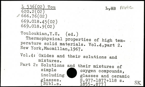 ~ 536(02) TOU IryfiB 620.2(02) ^666.76(02) 669.018.45(02) 669.018.9(02) T ouloukian,Y.S. (ed.) Thermophysical properties of high temperature solid materials.