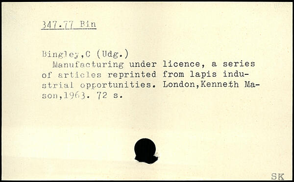 Bingley,C (Udg.) Manufacturing under licence, a series of articles reprinted from lapis industrial. opportunities. London,Kenneth Mason, 196 3