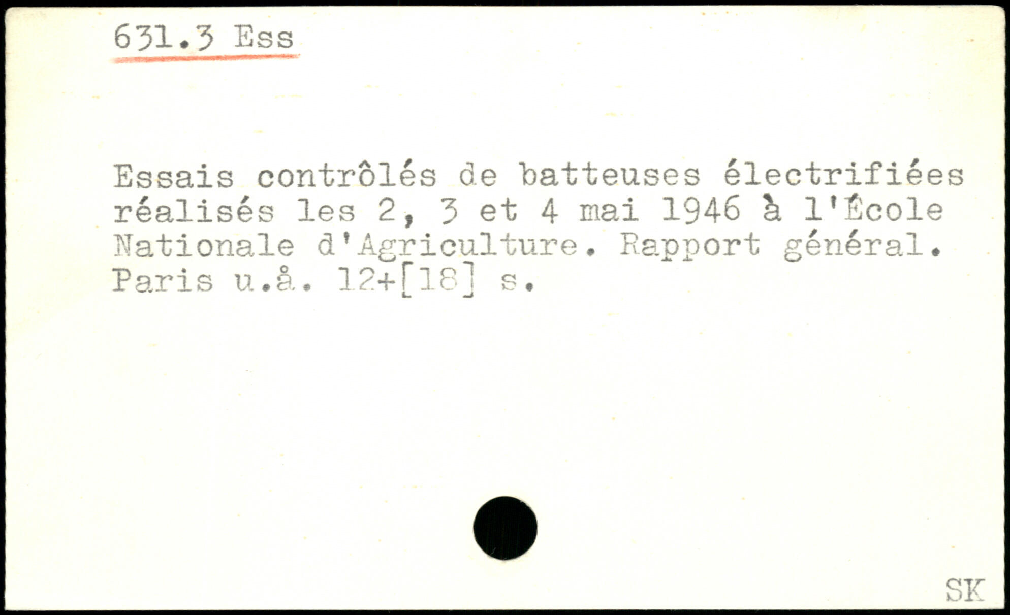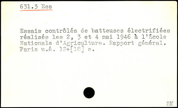Essais contrôlés de batteuses électrifiées réalisés les 2, 3 et 4 mai 1946 h l’Ecole Nationale d’Agriculture. Rapport général. Paris u.ê.. 12+ [18] s.