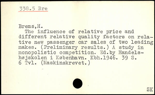 The influence of relative price and different relative quality factors on relative new passenger car sales of two leading makes. (Preliminary results.) A study in monopolistic competition. Ed.by Handelshøjskolen i København. Kbh.1946.