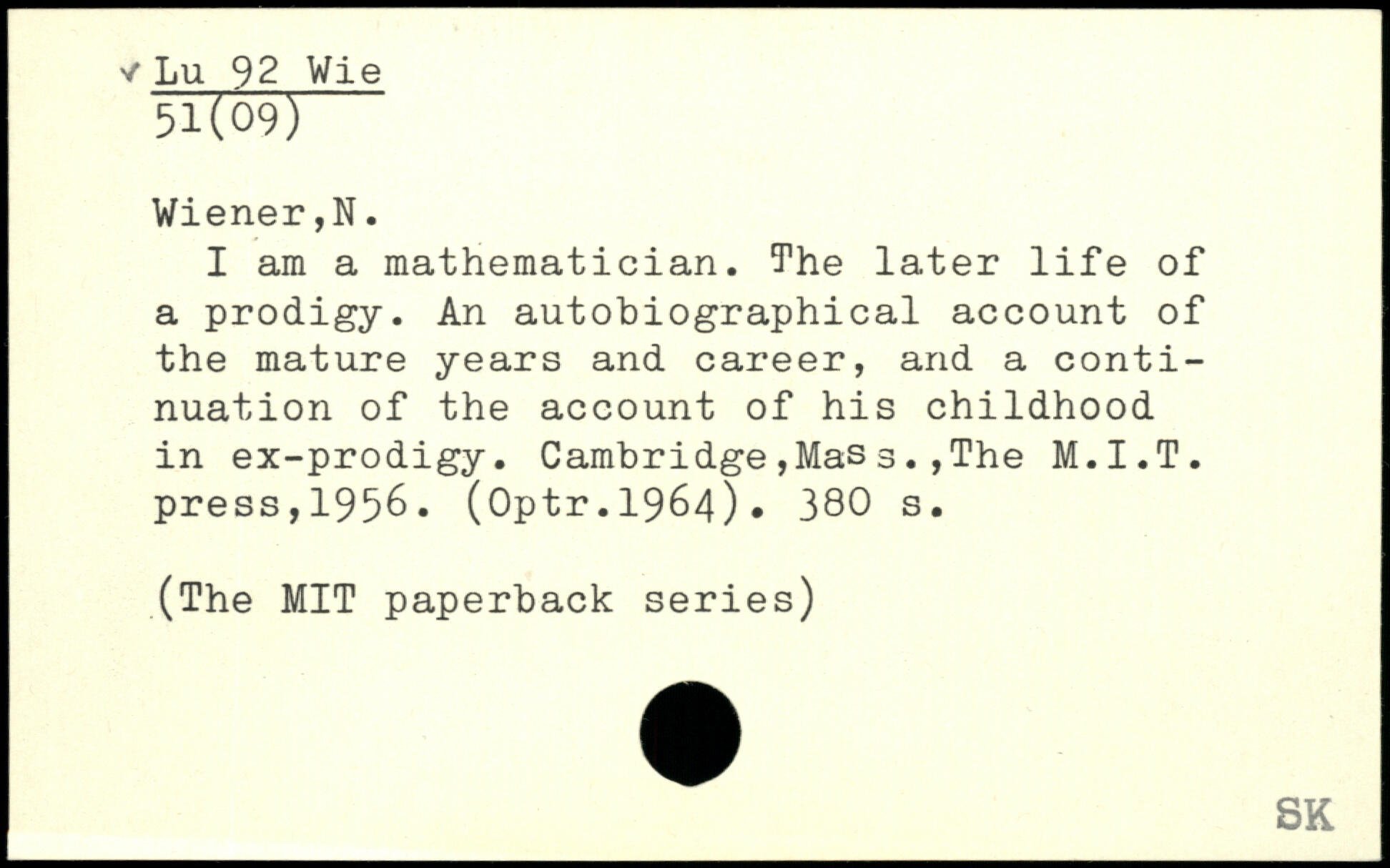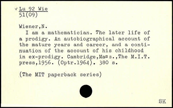 I am a mathematician. The later life of a prodigy. An autobiographical account of the mature years and career, and a continuation of the account of his childhood in ex-prodigy. Cambridge,Mas 3.,The M.I.T. press,1956. (Optr.1964).