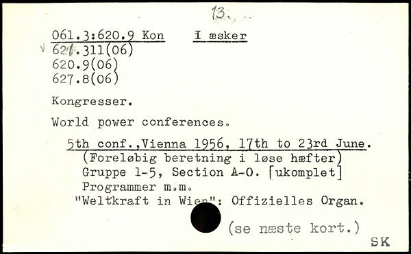 World power Conferences. 5th conf.,Vienna 1956. 17th to 23rd June. (Foreløbig beretning i løse hæfter) Gruppe 1-5, Section A-0. ["ukomplet] Programmer m.m, ”Weltkraft in Wi^^: Offizielles Organ. (se næste kort.) sK