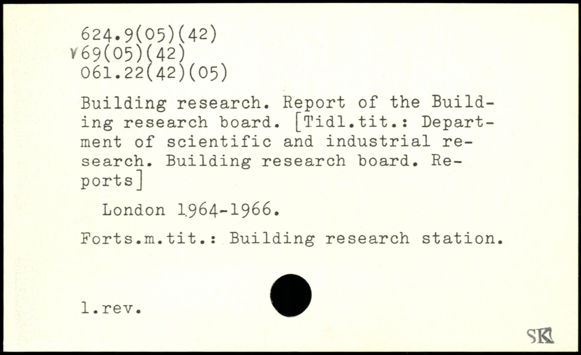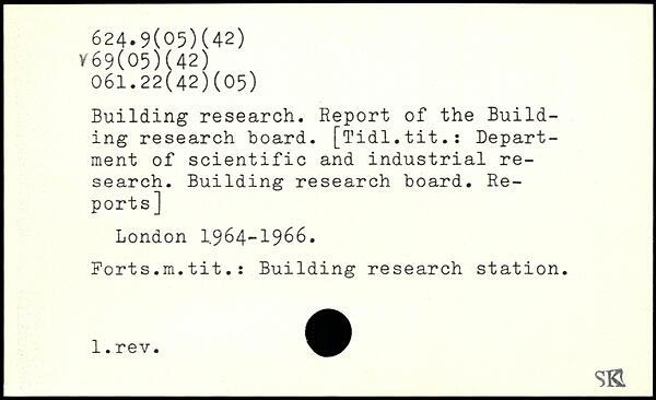 Building research. Report of the Building research board. [Tidl.tit.s Department of scientific and industrial research. Building research board. Reports] London I.964-1966. Forts.m.tit.: Building research station.