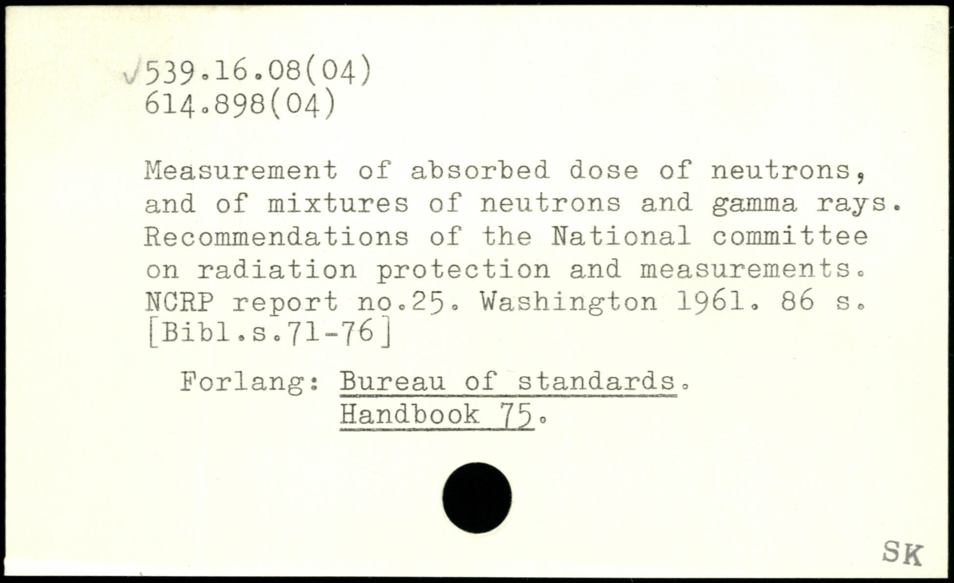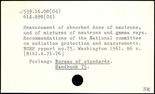 Measurement of absorbed dose of neutrons, and of mixtures of neutrons and gamma rays. Recommendations of the National committee on radiation protection and measurements, NGRP report nOo25.