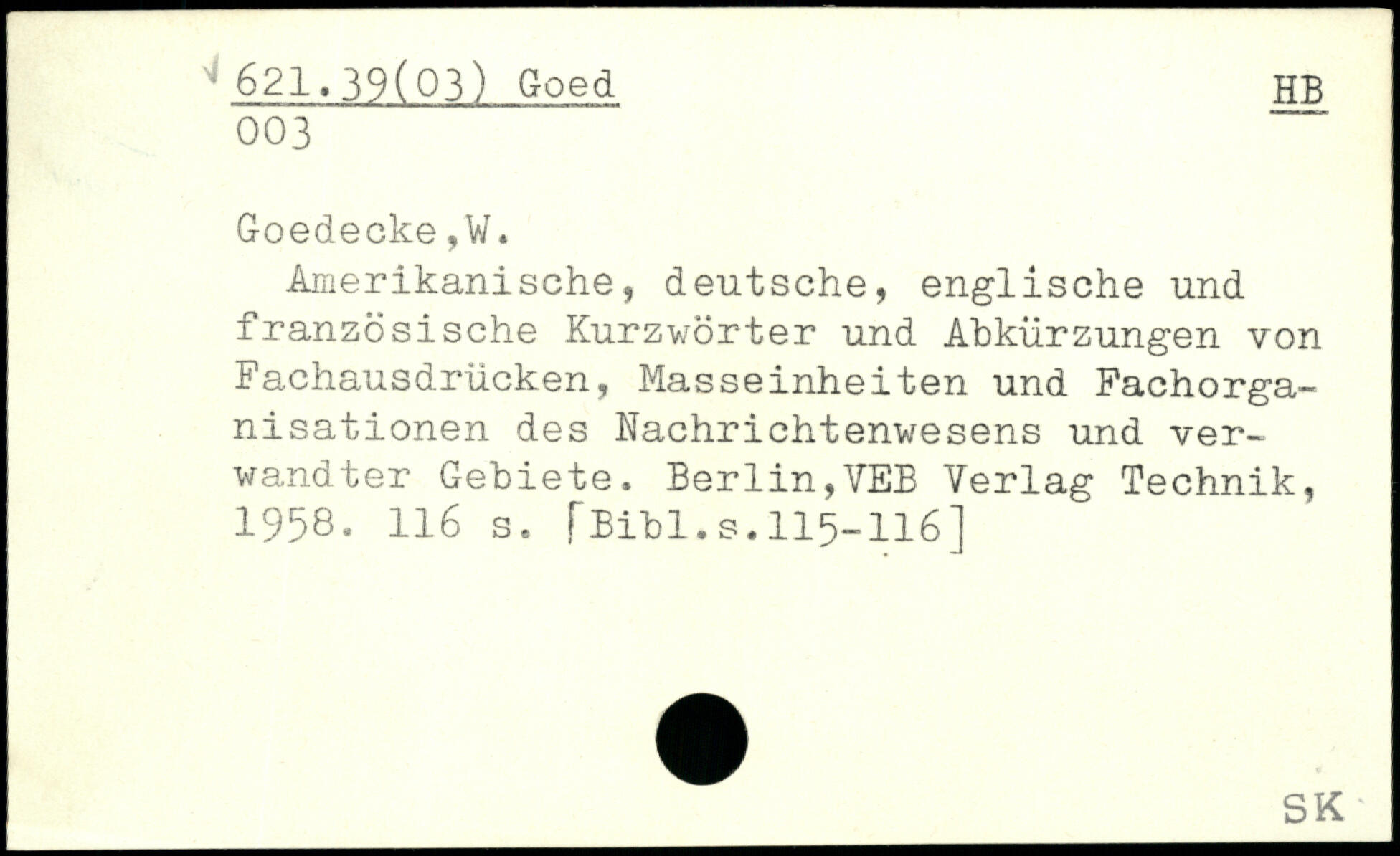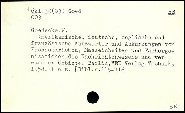 Amerikanische, deutsche, englische und französische Kurzwörter und Abkürzungen von Fachausdrücken, Masseinheiten und Fachorganisationen des Nachrichtenwesens und verwandter Gebiete.