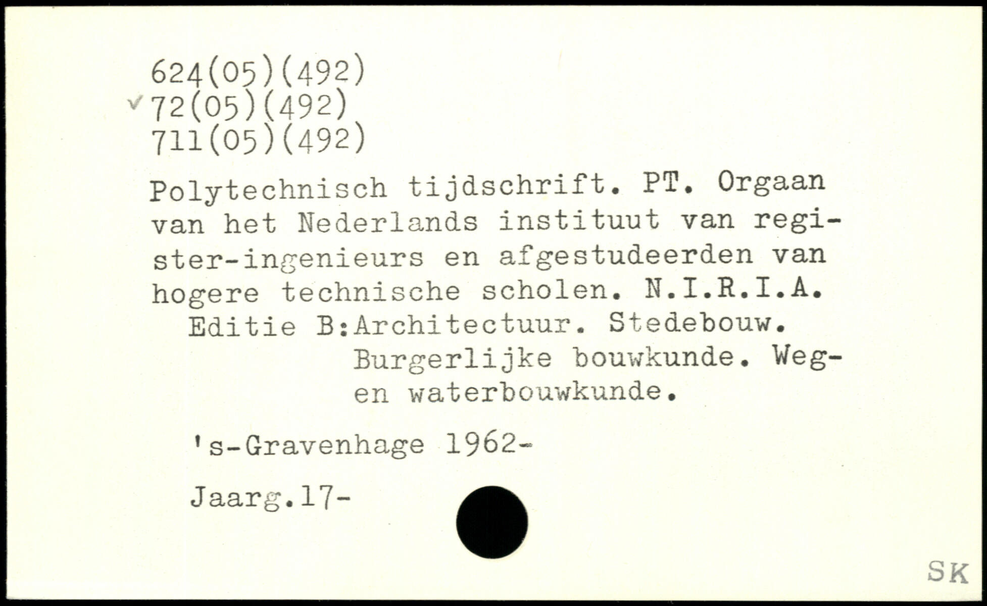 Polytechnisch tijdschrift. PT. Orgaan van het Nederlands instituut van regi-ster-ingenieurs en afgestudeerden van hogere technische scholen. N.I.R.I.A. Editie BrArchitectuur. Stedehouw. Burgerlijke bouwkunde. Wegen waterbouwkunde. 1s-Gravenhage 1962- Jaarg. 17-