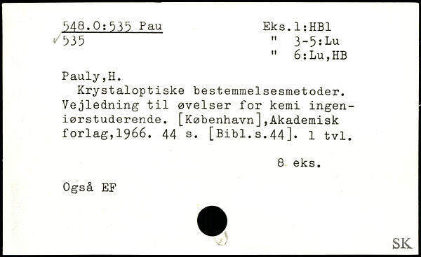 Krystaloptiske bestemmelsesmetoder. Vejledning til øvelser for kemi ingeniørstuderende. [København],Akademisk forlag,1966.