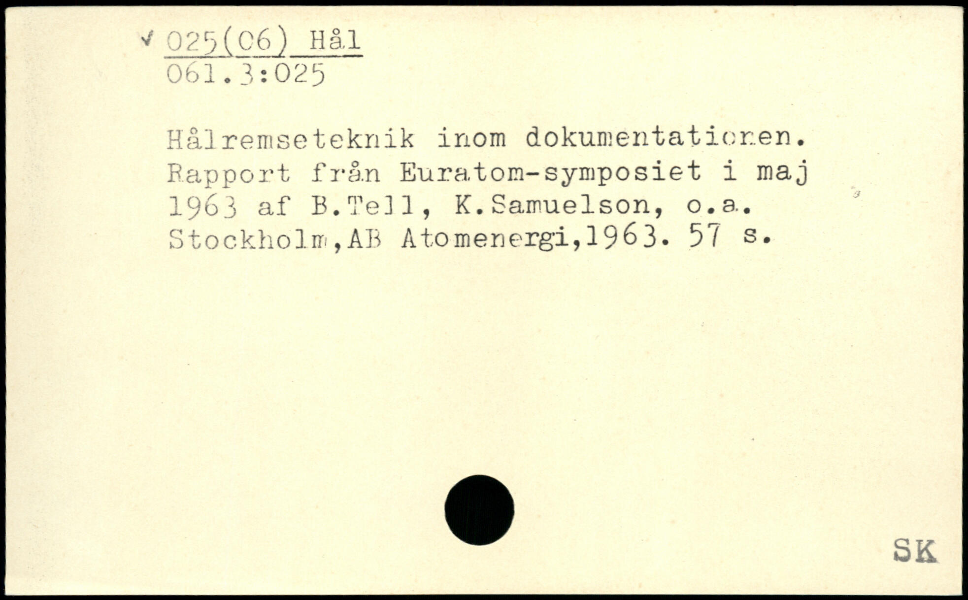 Hålremseteknik inom dokumentationen. Rapport från Euratom-symposiet i maj 1963 af B.Tell, K.Samuelson, o.a..