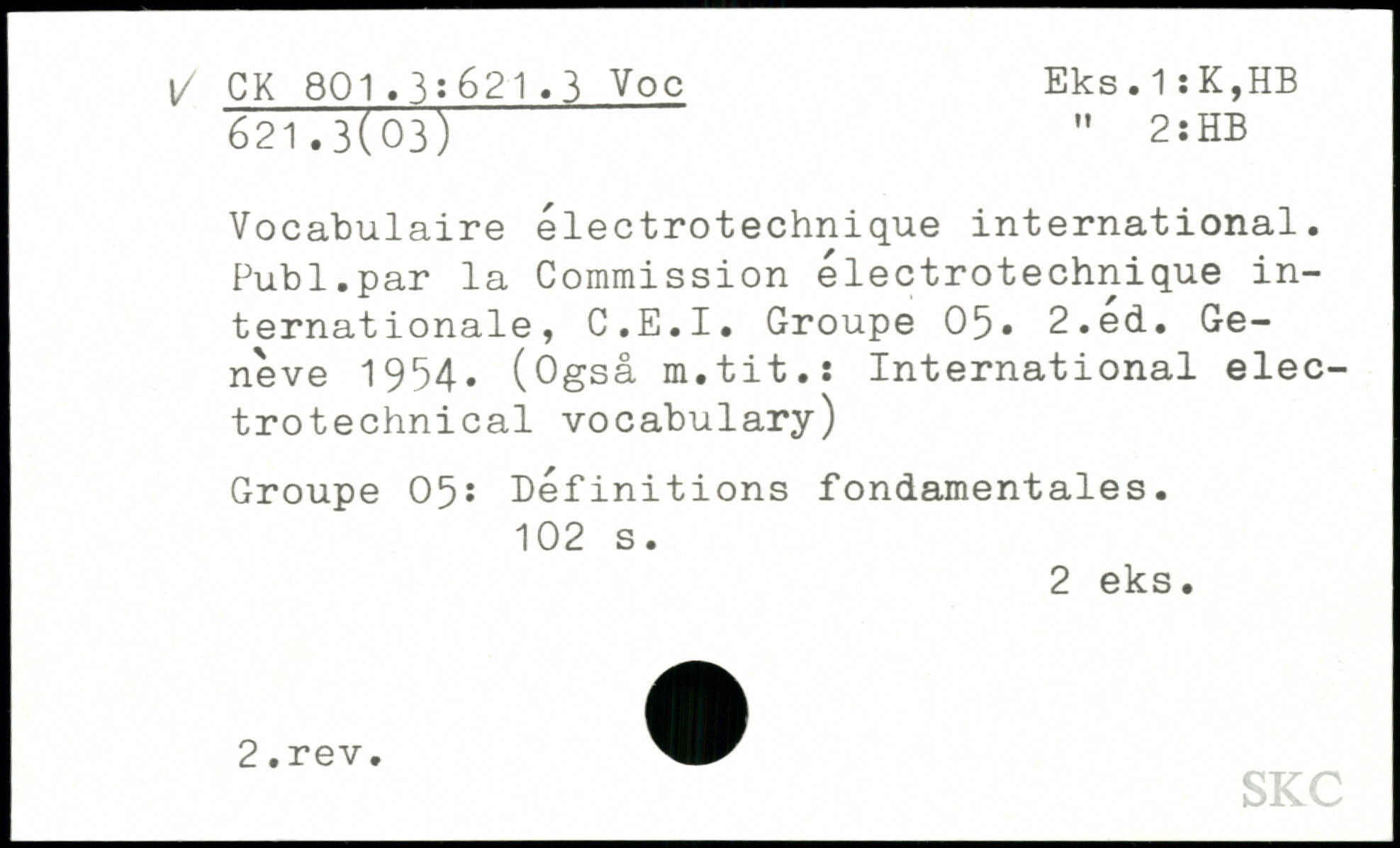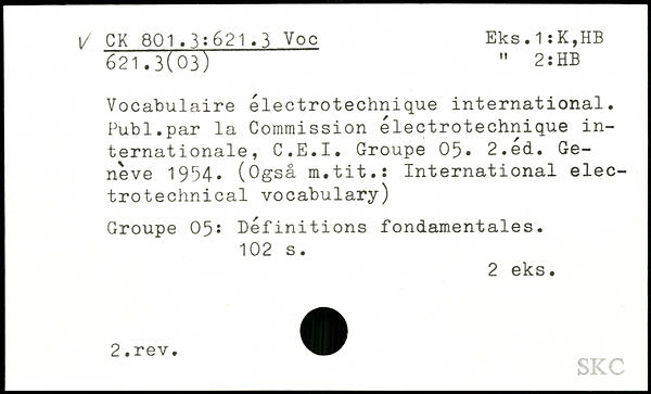 Vocabulaire électrotechnique international. Publ.par la Commission électrotechnique internationale, C.E.I. Groupe 05