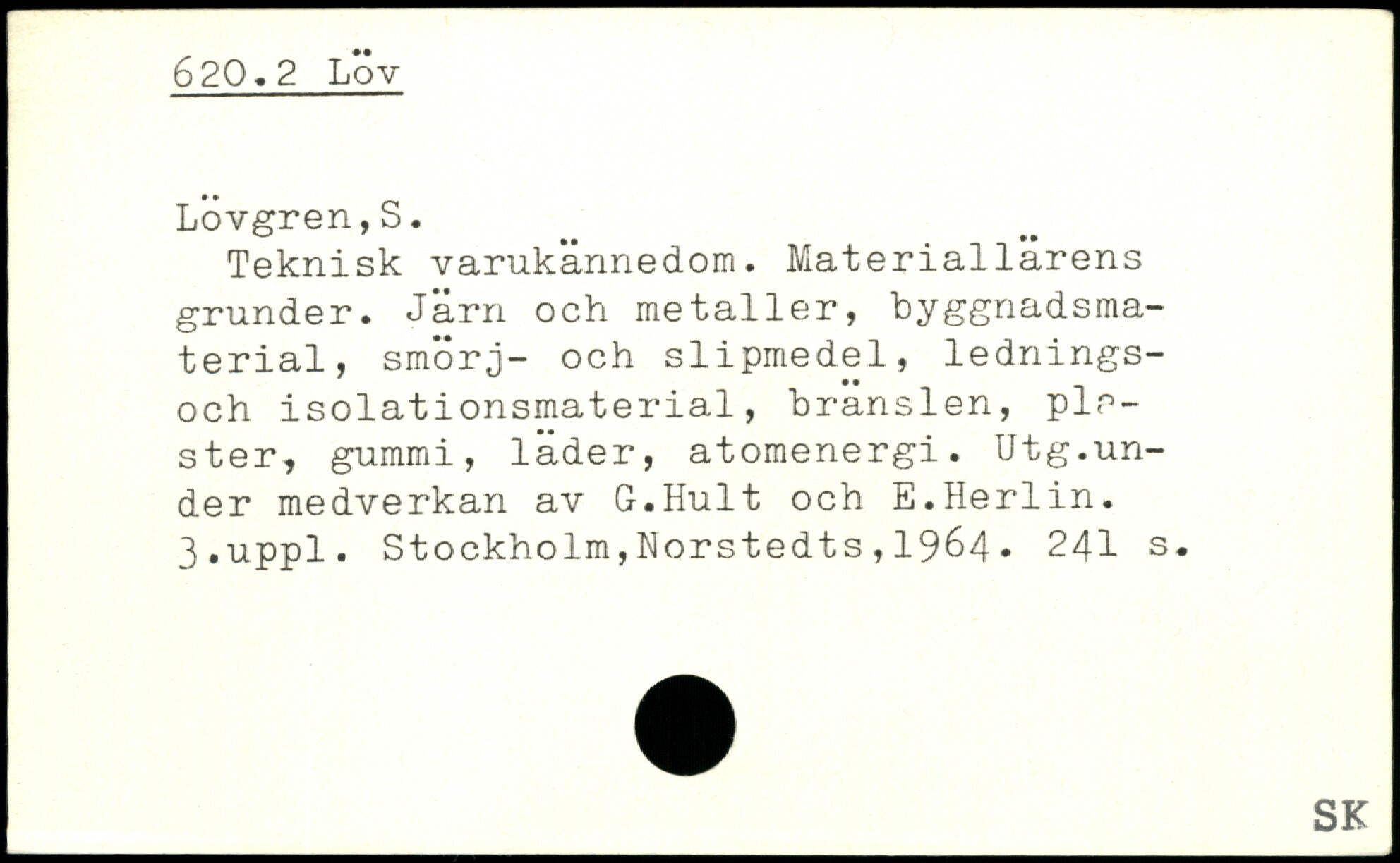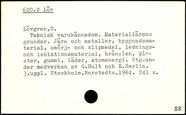 Teknisk varukännedom. Materiallarens grunder. Jarn och metaller, byggnadsmaterial, smörj- och slipmedel, lednings-och isolationsmaterial, bränslen, plr-ster, gummi, läder, atomenergi. Utg.under medverkan av G.Hult och E.Herlin.