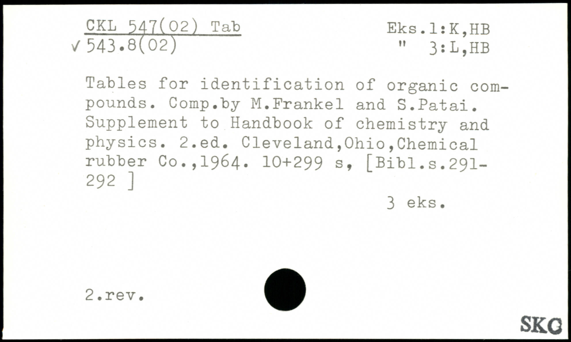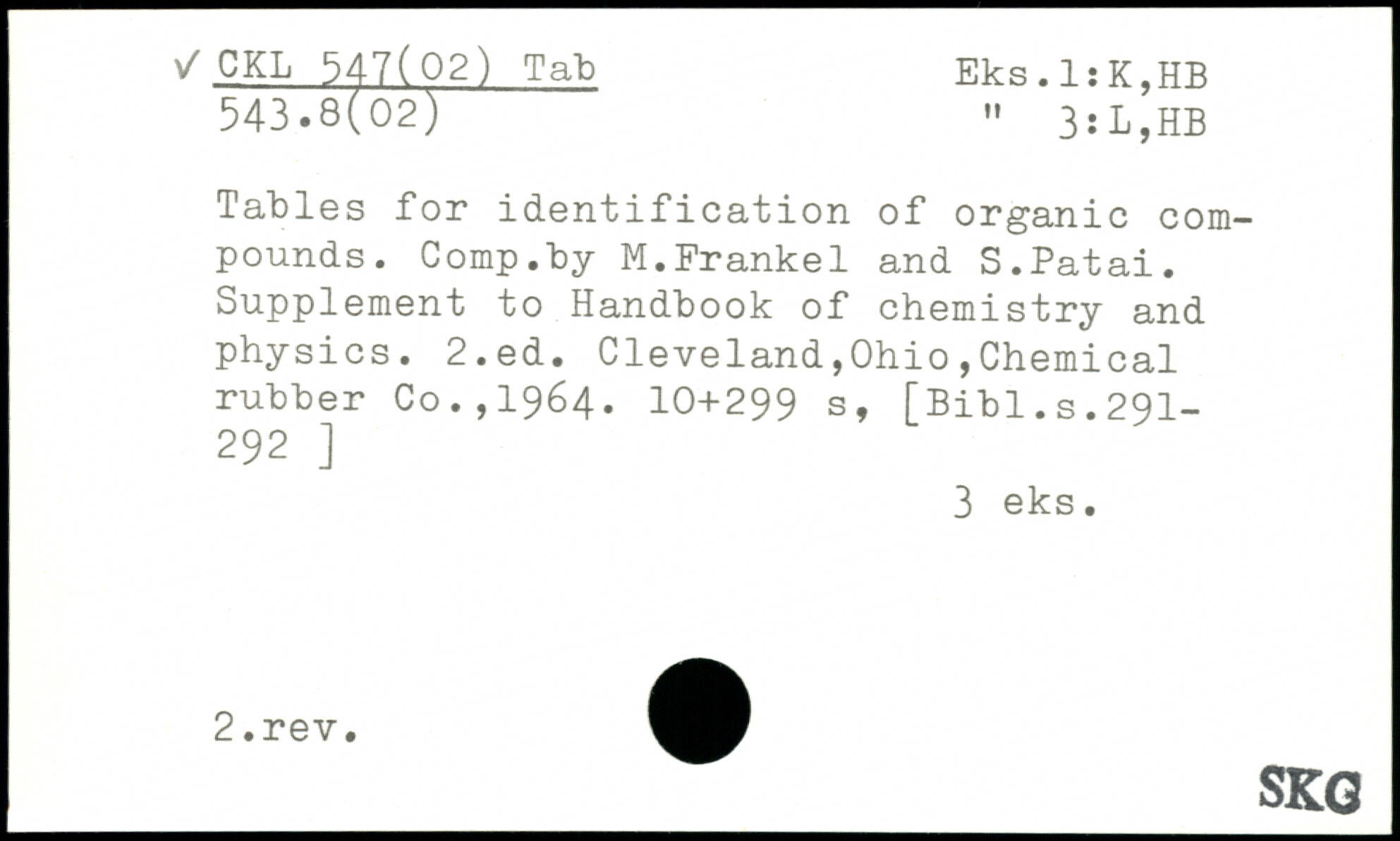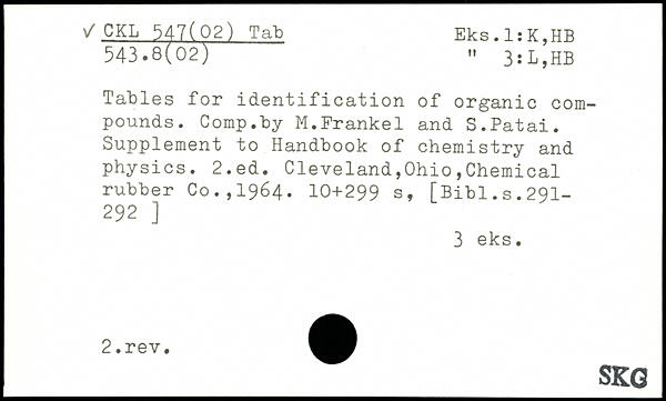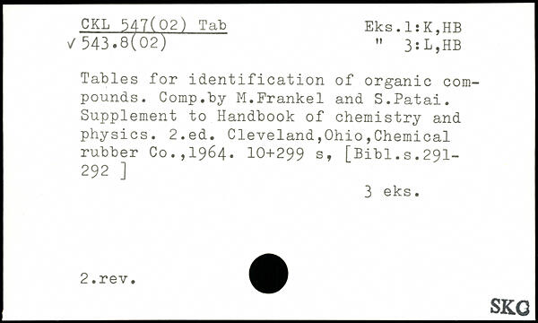 Tables for identification of organic compounds. Comp.by M.Frankel and S.Patai. Supplement to Handbook of chemistry and physics.