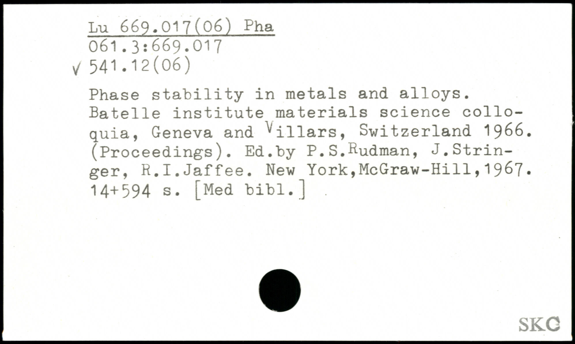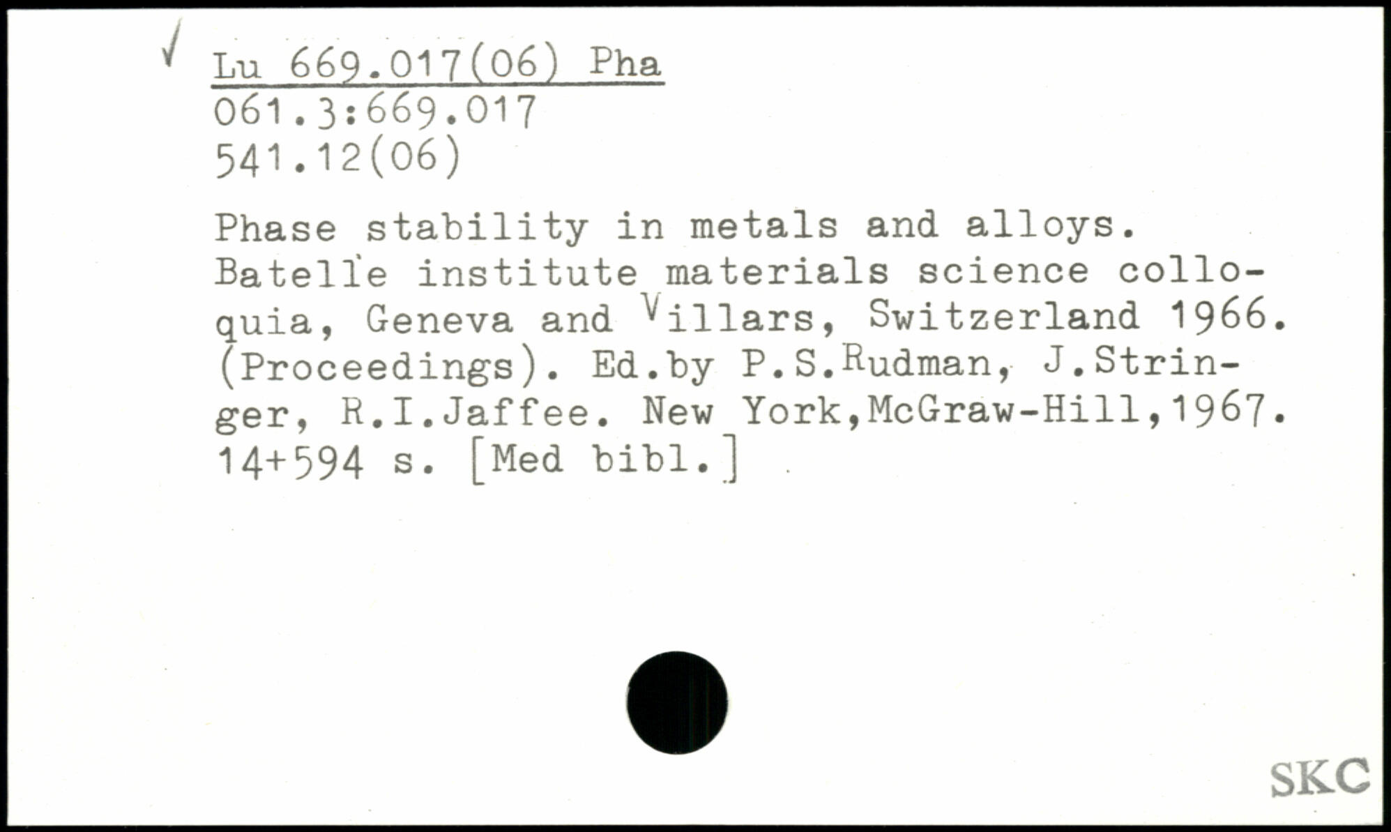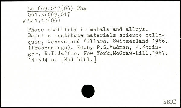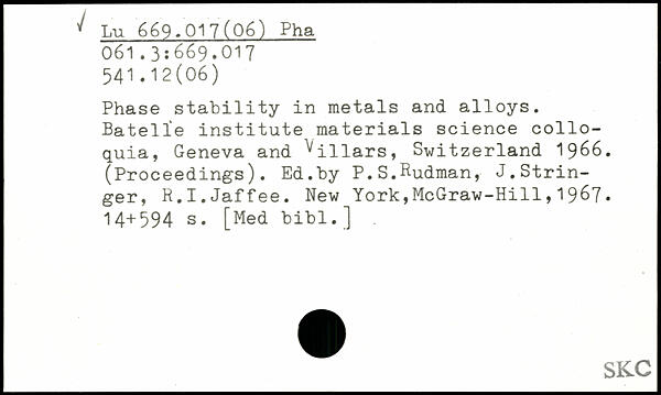 Phase stability in metals and alloys. Batelïe institute materials science collo-quia, Geneva and ^illars, Switzerland 1966. (Proceedings). Ed.by P.S.Rudman, J.Stringer, R.I.Jaffee.