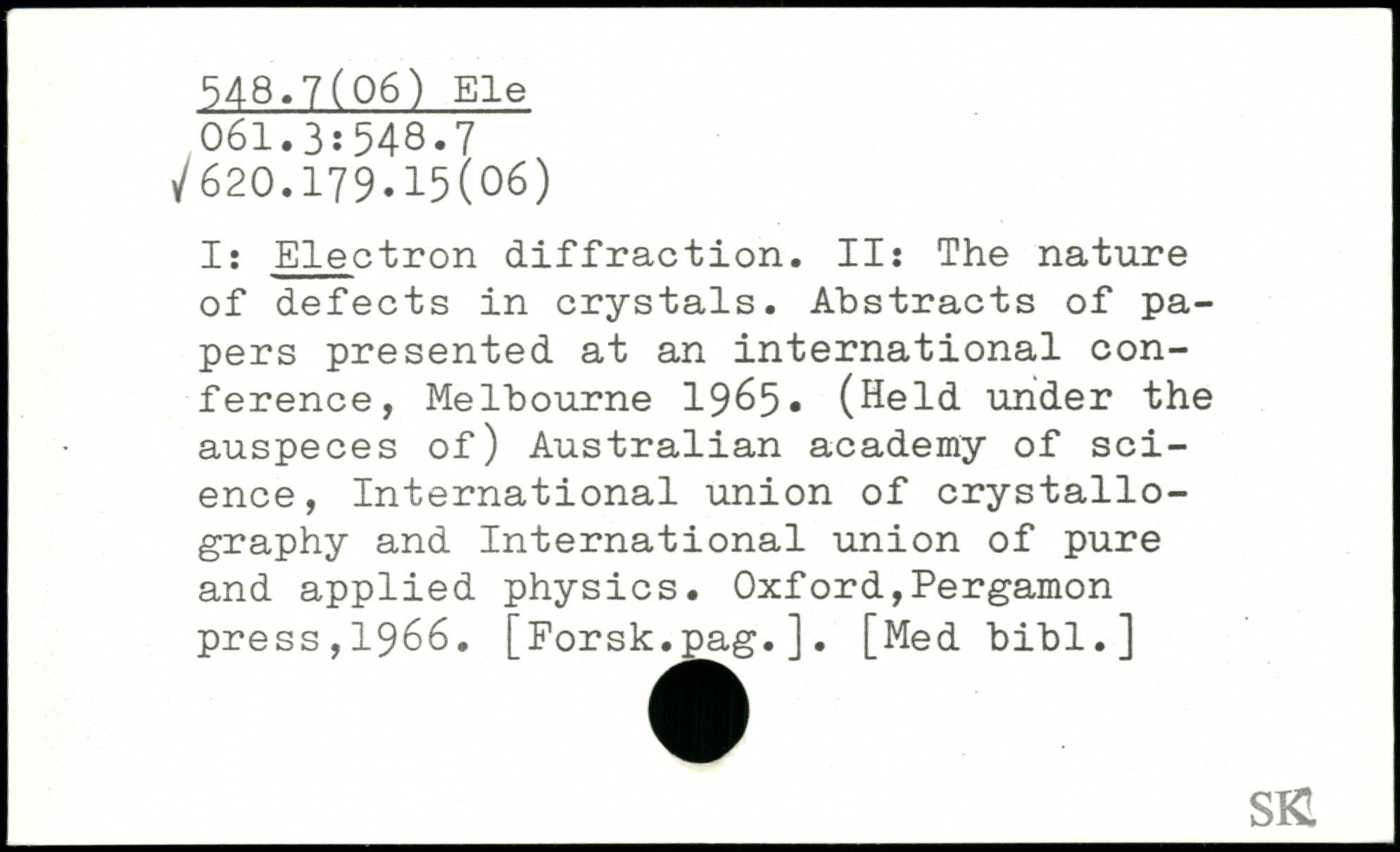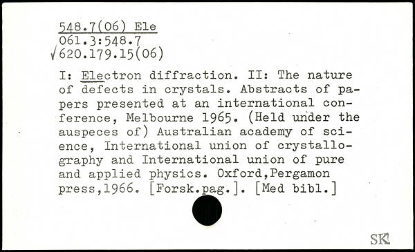 I: Electron diffraction. II: The nature of defects in crystals. Abstracts of papers presented at an international conference, Melbourne 1965. (Held under the auspeces of) Australian academy of science, International union of crystallography and International union of pure and applied physics.