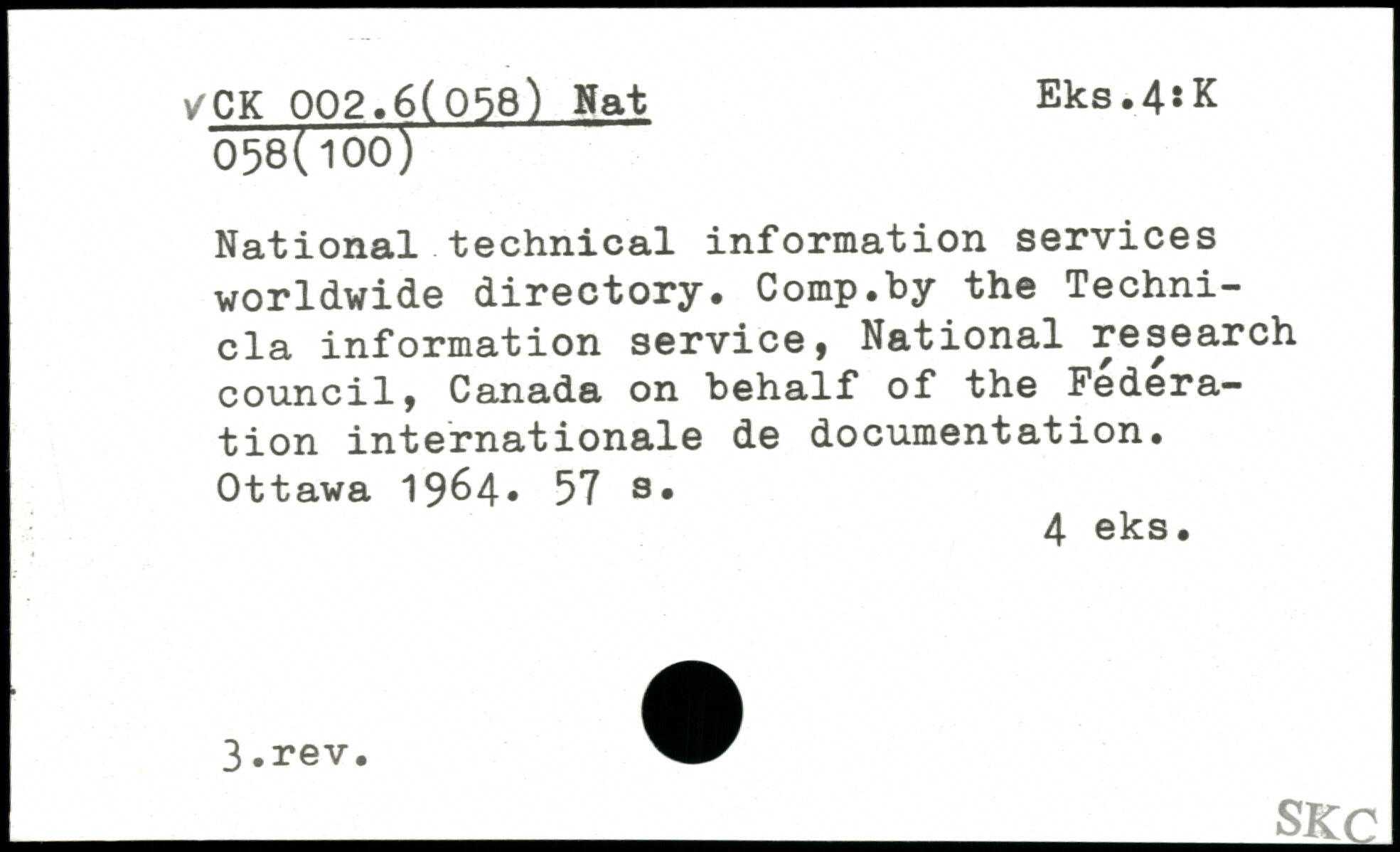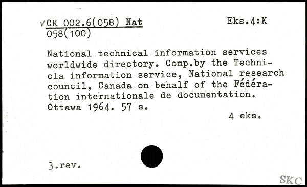 National technical information services worldwide directory. Comp.by the Techni-cla information service, National research council, Canada on behalf of the Federation internationale de documentation.