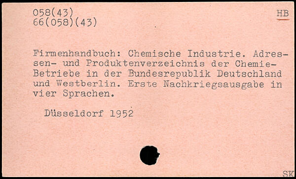 Firmenhandbuch: Chemische Industrie. Adressen- und Produktenverzeichnis der Chemie-Betriebe in der Bundesrepublik Deutschland und Westberlin. Erste Nachkriegsausgabe in vier Sprachen. Düsseldorf 1952