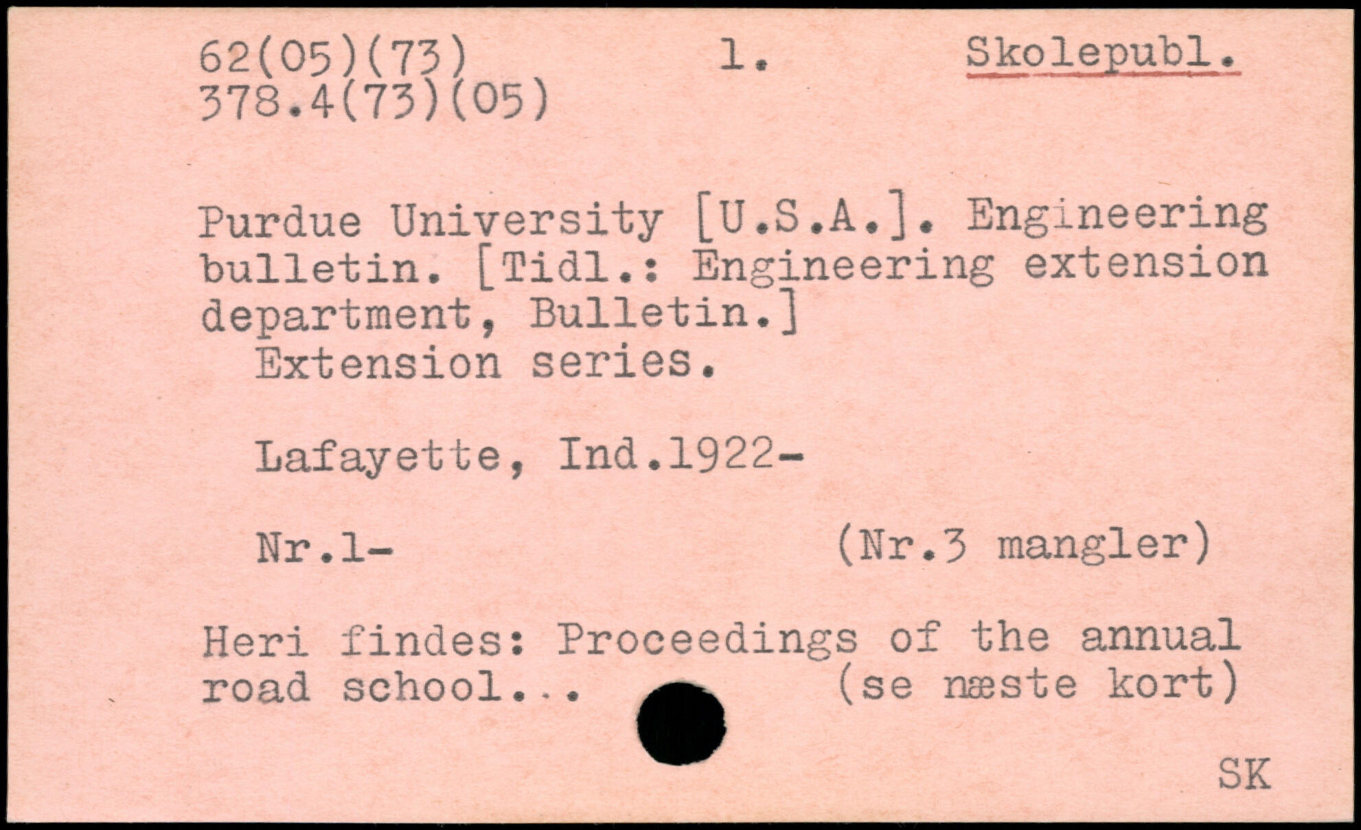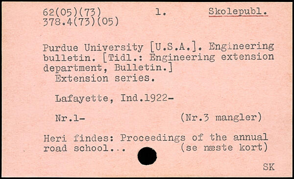 Purdue University [U.S.A.]. Engineering bulletin. [Tidl.: Engineering extension department, Bulletin.] Extension series. Lafayette, Ind.1922- Nr.l- (Nr.3 mangier) Heri findes: Proceedings of the annual road school... (se næste kort)