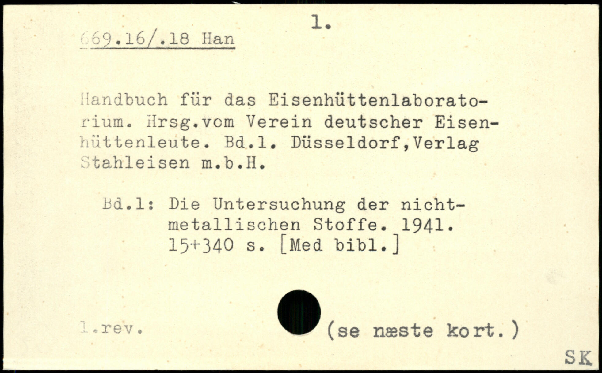 Handbuch für das Eisenhüttenlaboratorium. Hrsg.vom Verein deutscher Eisenhüttenleute. Bd.l. Düsseldorf,Verlag Stahleisen m.b.H. bd.l: Die Untersuchung der nichtmetallischen Stoffe. 1941.