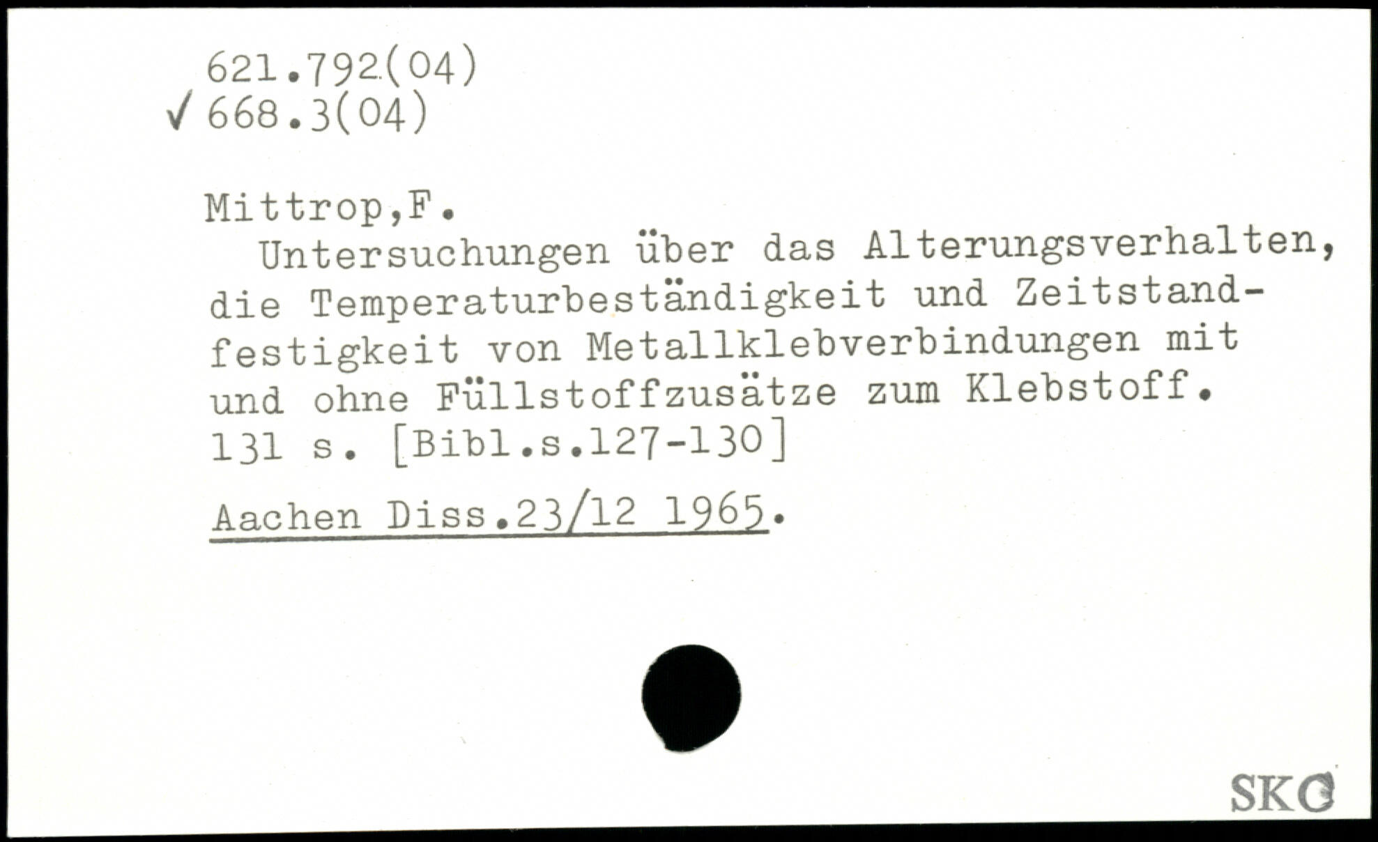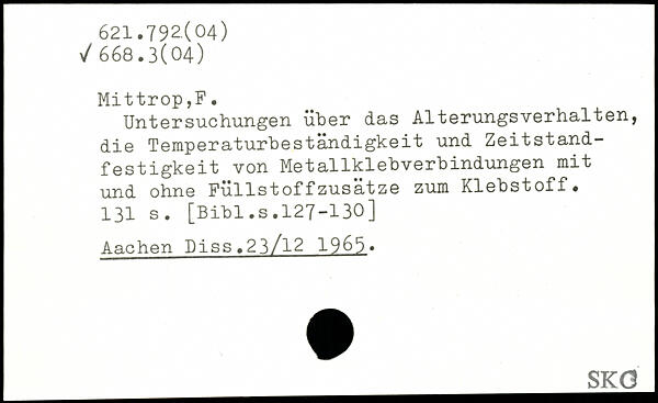 Untersuchungen über das Alterungsverhalten, die Temperaturbeständigkeit und Zeitstandfestigkeit von Metallklebverbindungen mit und ohne Füllstoffzusätze zum Klebstoff.