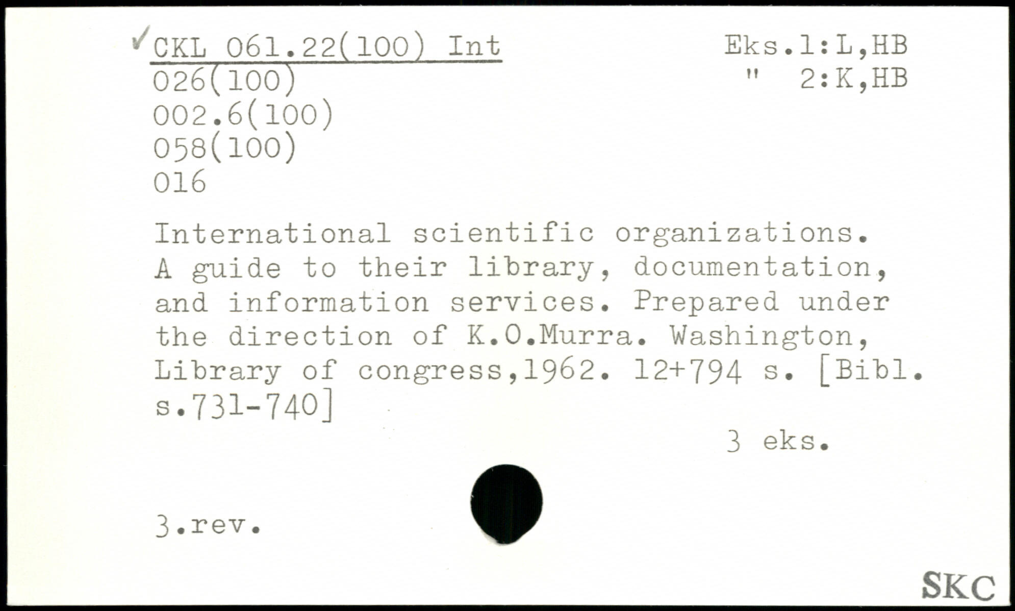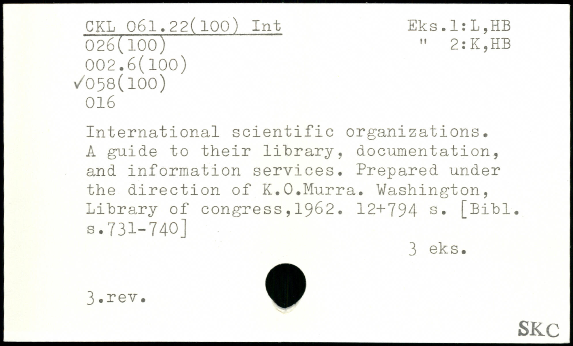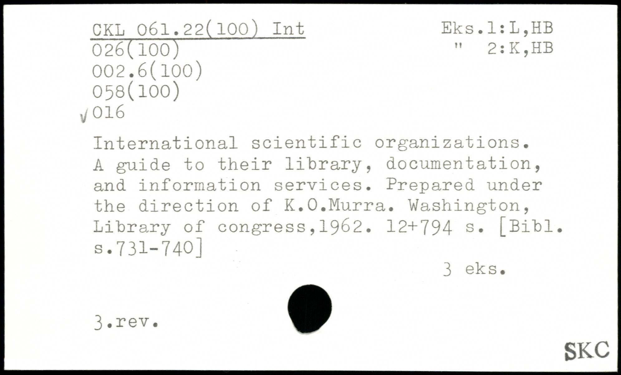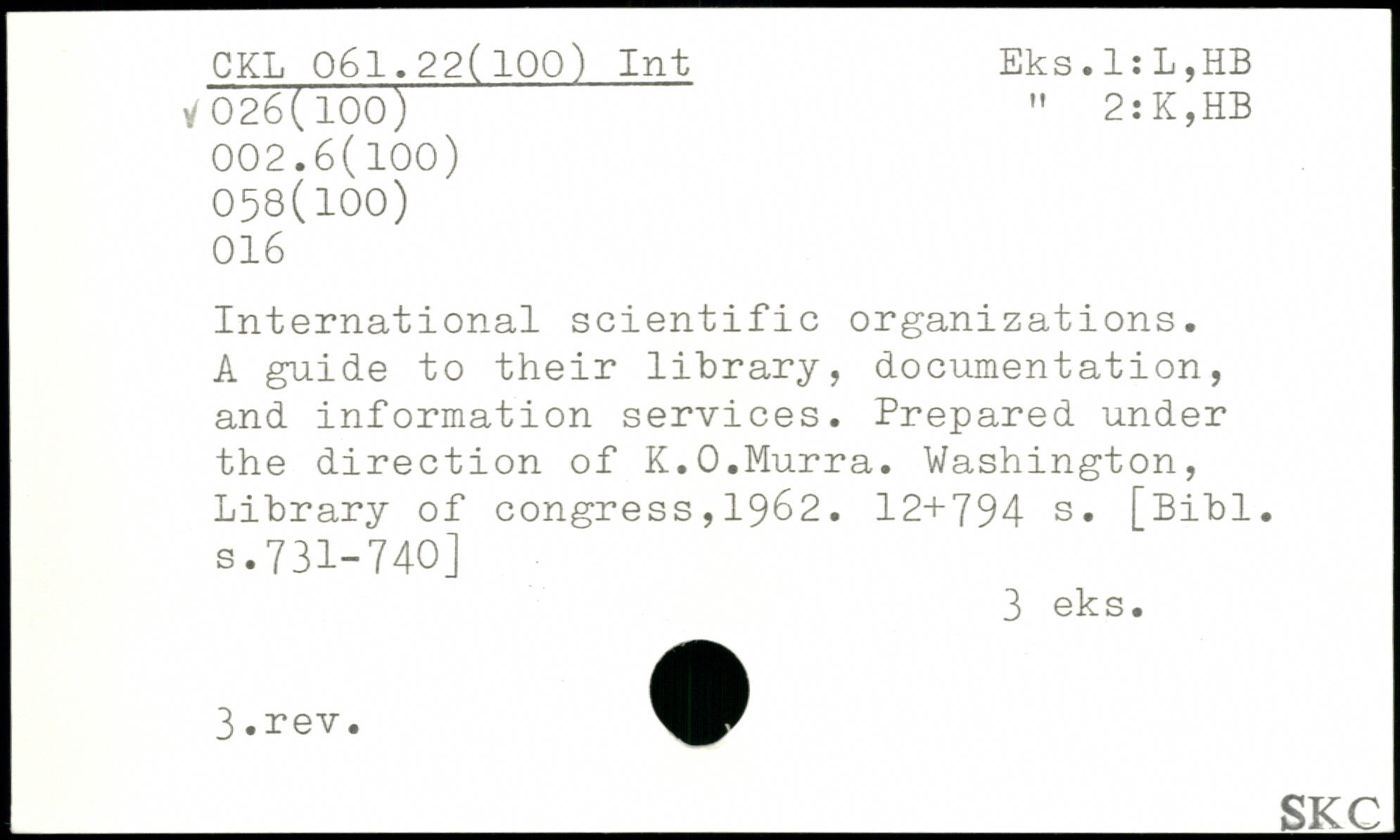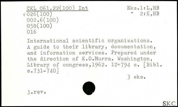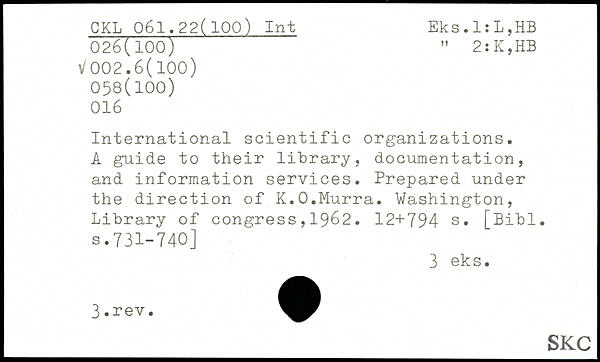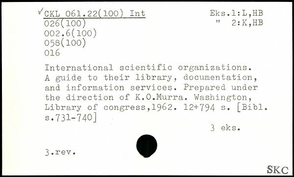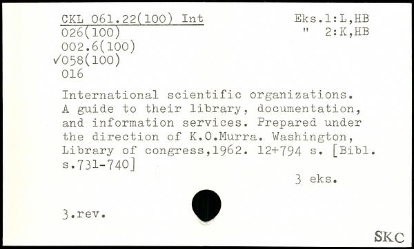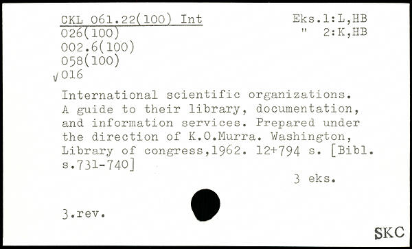 International scientific organizations. A guide to their library, documentation, and information services. Prepared under the direction of K.O.Murra.
