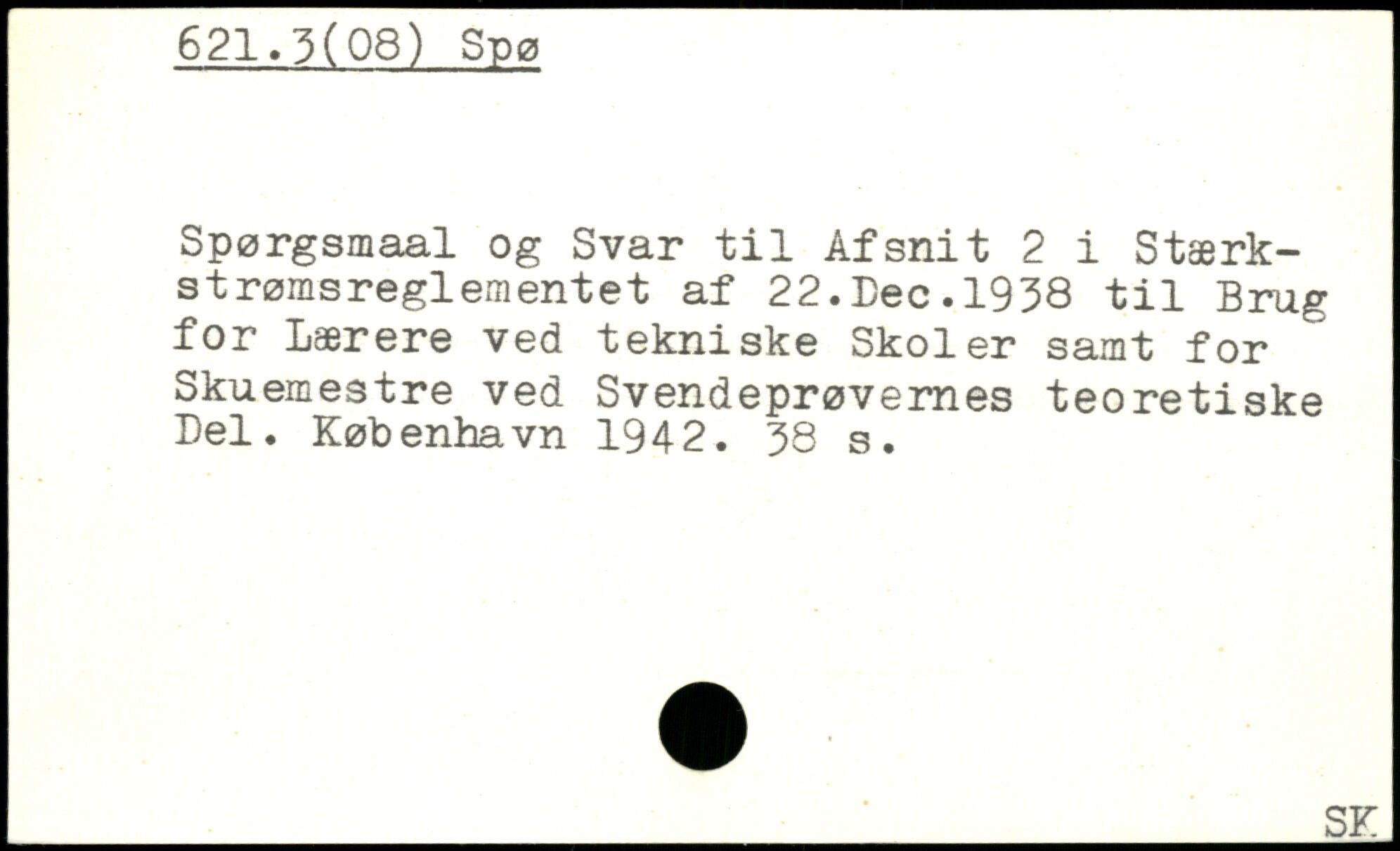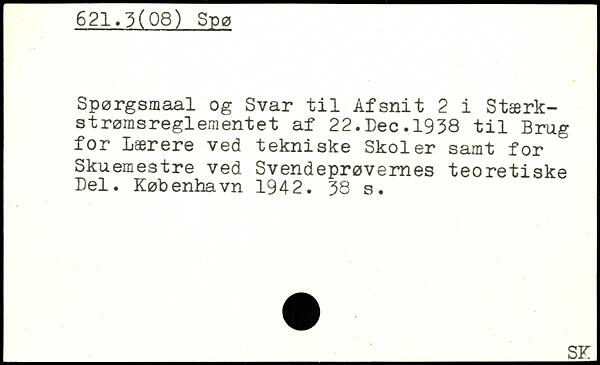 Spørgsmaal og Svar til Afsnit 2 i Stærkstrømsreglementet af 22.Lee.1938 til Brug for Lærere ved tekniske Skoler samt for Skuemestre ved Svendeprøvernes teoretiske Del.