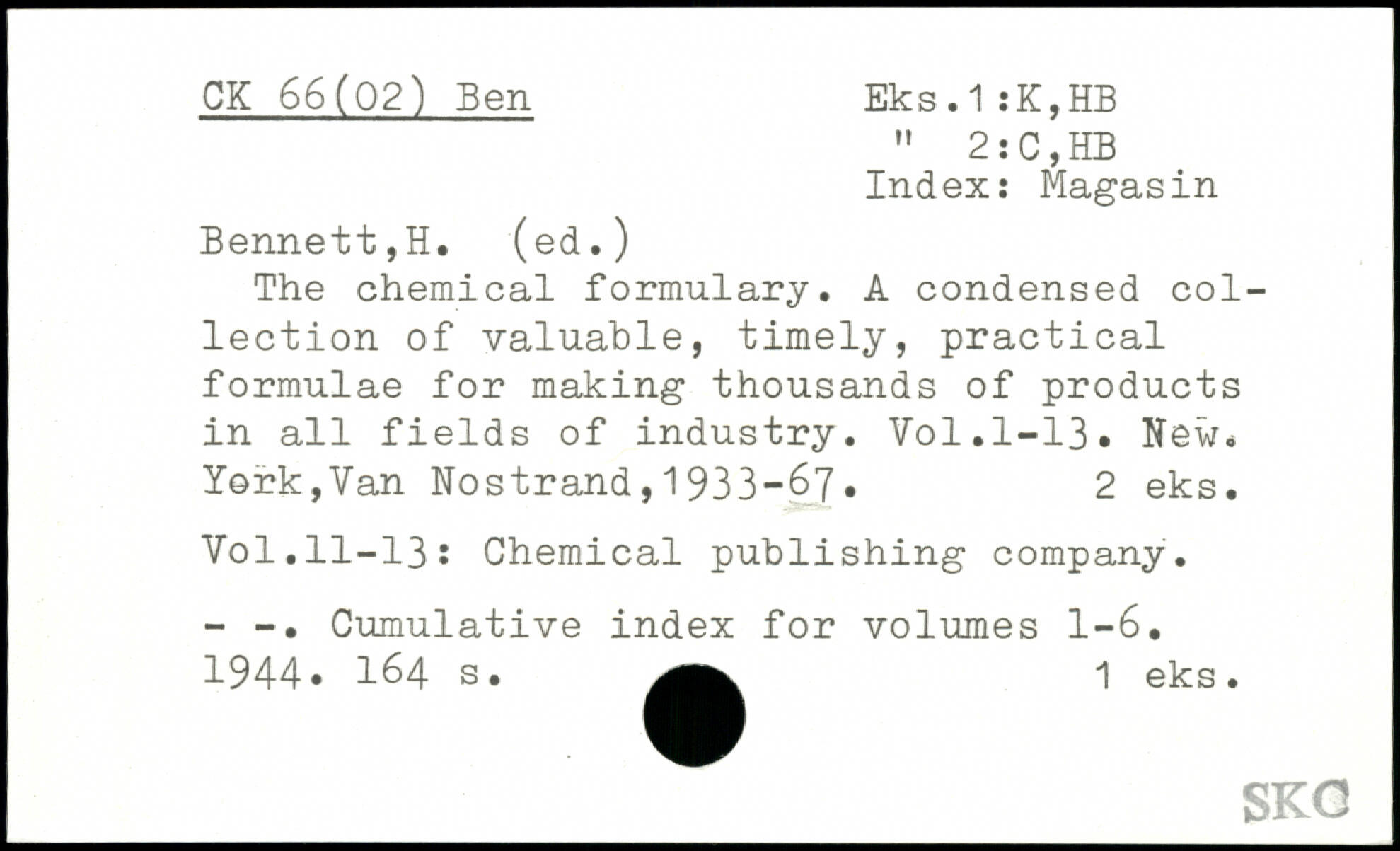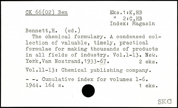Index: Magasin Bennett,H. (ed.) The chemical formulary. A condensed collection of valuable, timely, practical formulae for making thousands of products in all fields of industry.