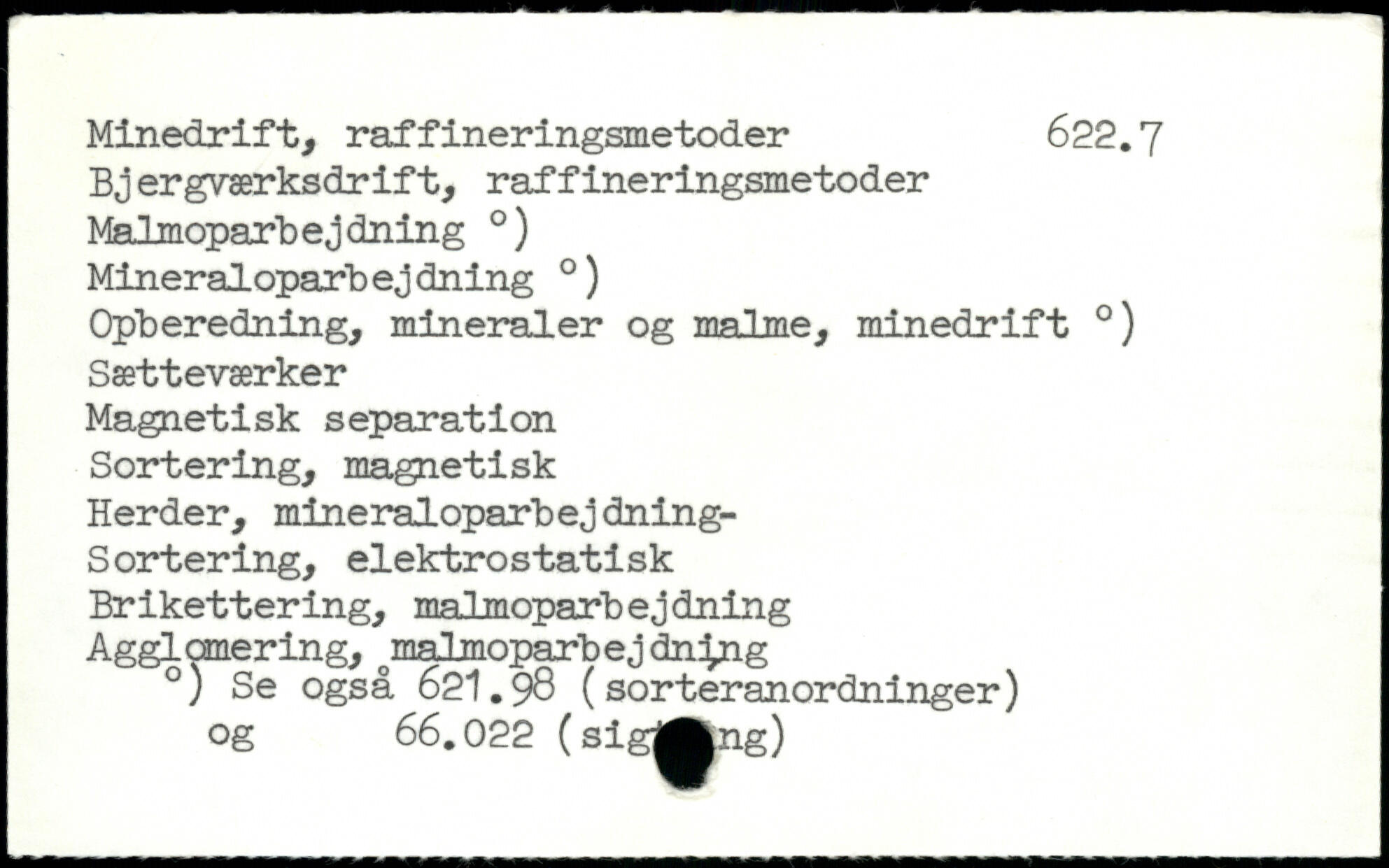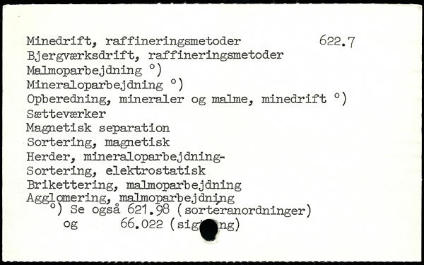 Minedrift, raffineringsmetoder 622.7 Bjergværksdr if t, raffineringsmetoder Malmoparbejdning .) Mineraloparbejdning .) Opberedning, mineraler og malme, minedrift .) Sætteværker Magnetisk separation Sortering, magnetisk Herder, mineraloparbej dning- Sortering, elektrostatisk Brikettering, malmoparbejdning Agglcmering, malmoparbej dnfoig .) Se også 621.98 (sorteranordninger) og 66.022 (sig^^ng)