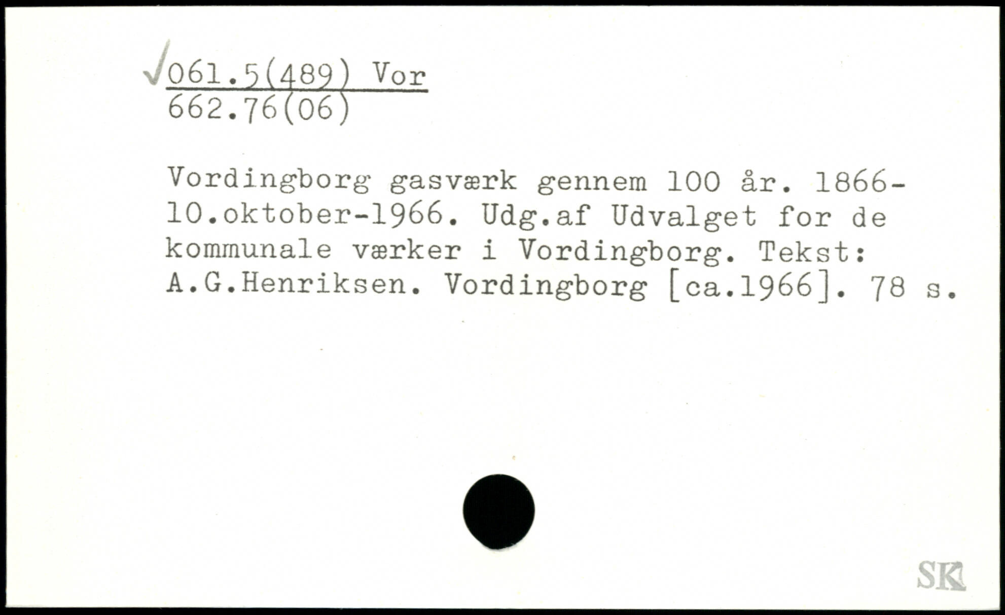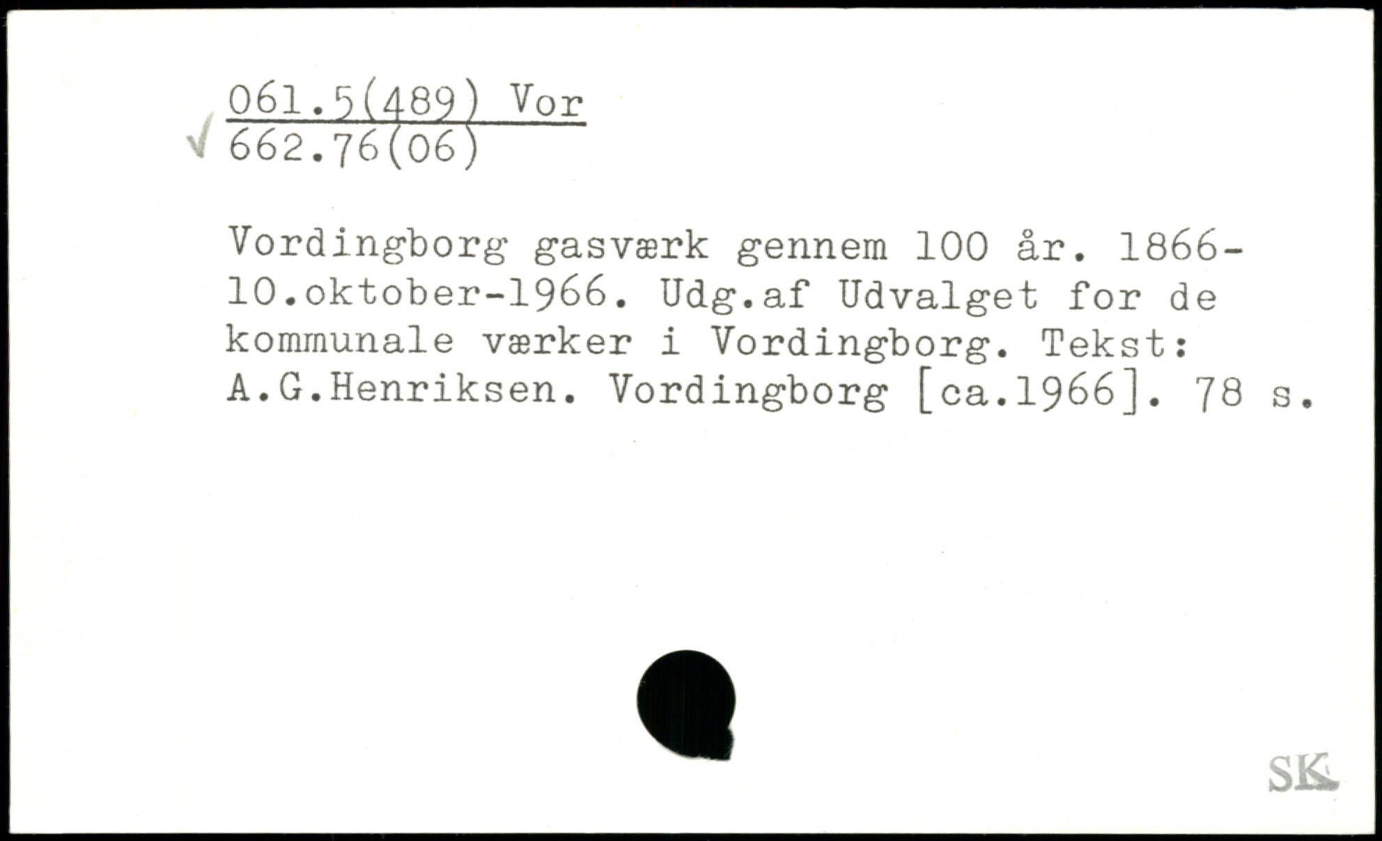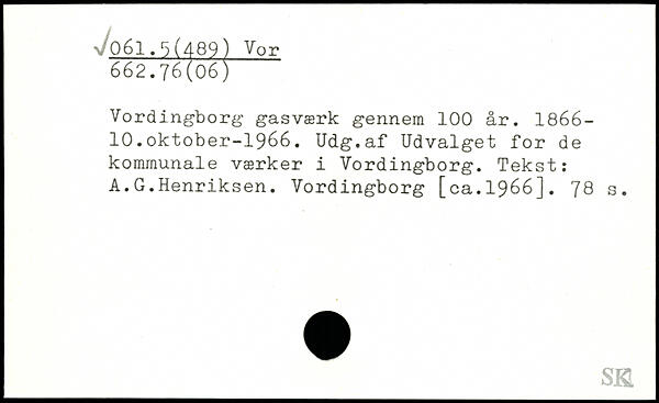 Vordingborg gasværk gennem 100 år. 1866-10.oktober-1966. Udg.af Udvalget for de kommunale værker i Vordingborg. Tekst: A.G.Henriksen. Vordingborg [ca.1966].