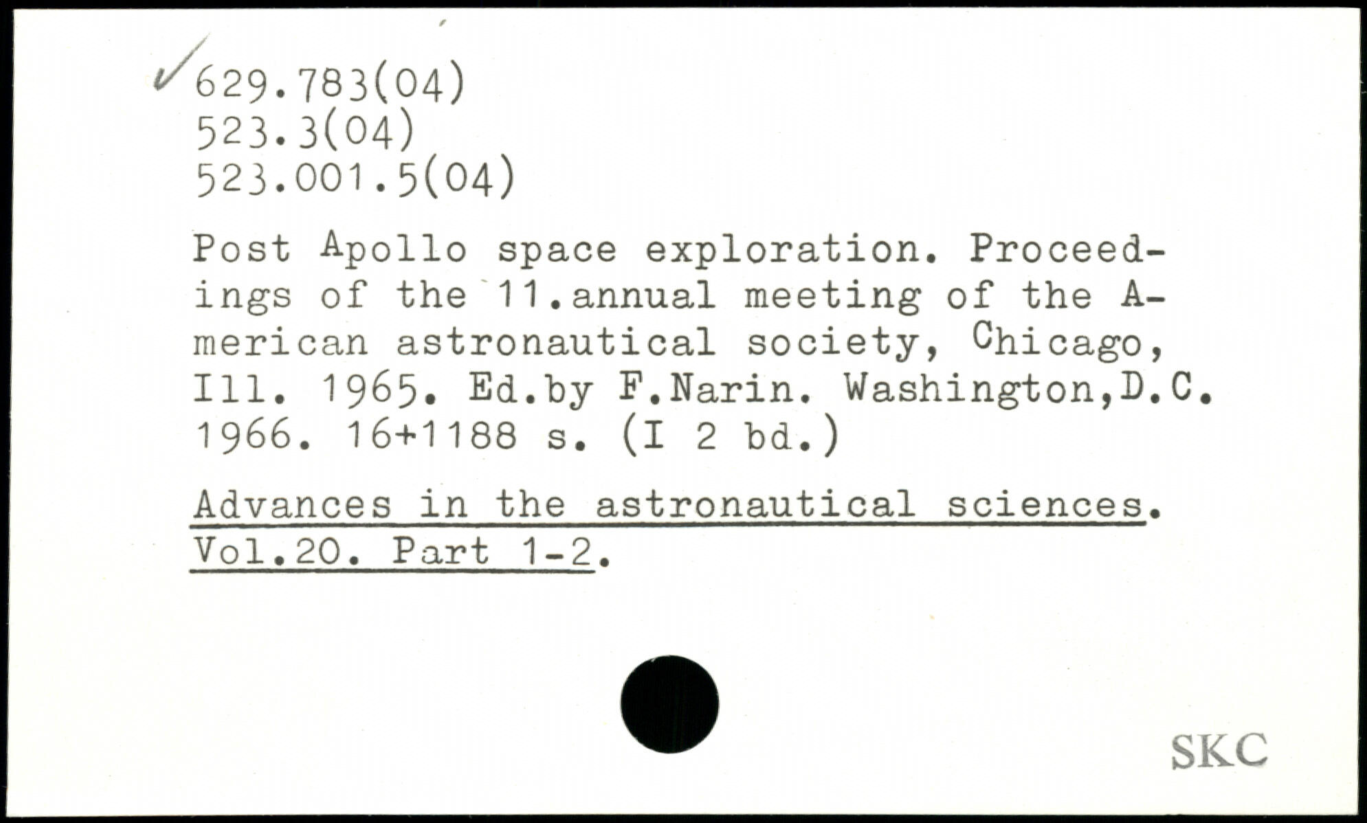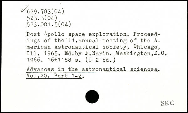 Post Apollo space exploration. Proceedings of the 11.annual meeting of the A-merican astronautical society, Chicago, 111. 1965, Ed.by F.Narin. Washington,D.C. 1966.