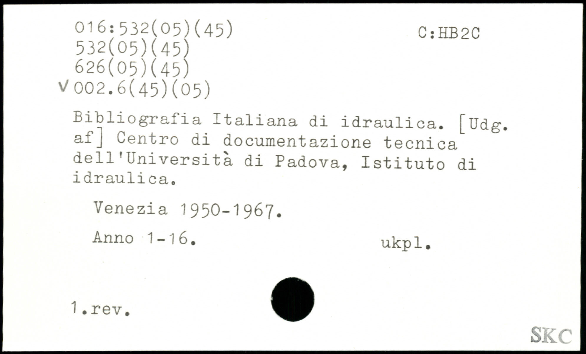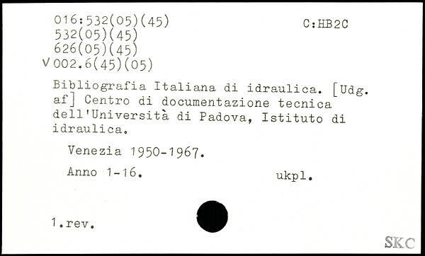 Ho^rafi a I tali ana di idraulica. [Udg. afj Centro di documentazione tecnica dell'Universita di Padova, Istituto di idraulica. Venezia 1950-1967. Anno 1-16. ukpl.