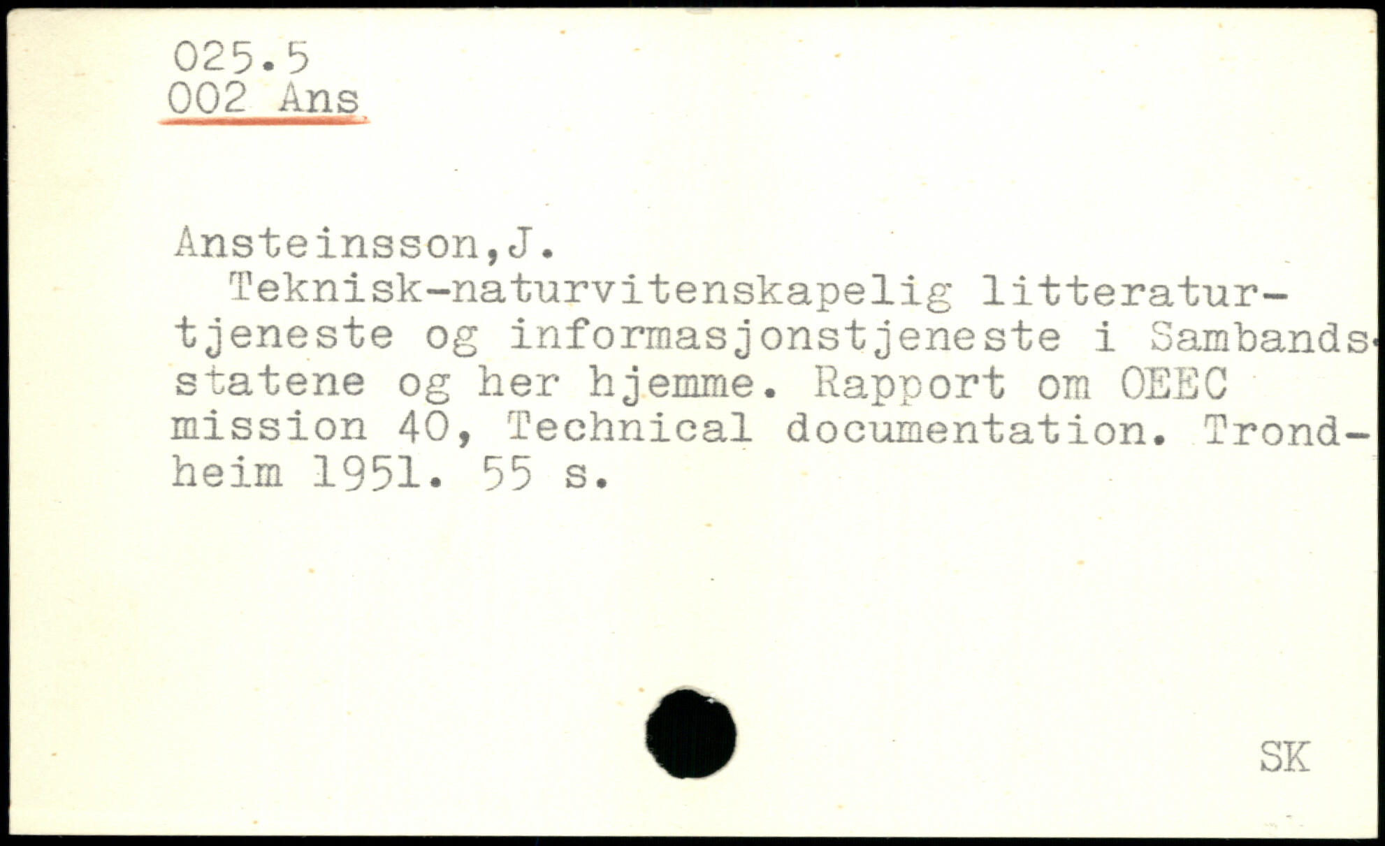 Teknisk-naturvitenskapelig litteratur-tjeneste og informasjonstjeneste i Sambands' statene og her hjemme. Rapport om OEEC mission 40, Technical documentation. Trond-heim 1951.