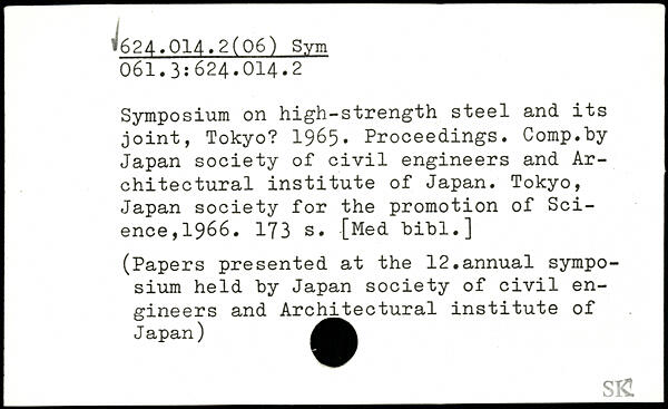 Symposium on high-strength steel and its joint, Tokyo? 1965. Proceedings. Comp.by Japan society of civil engineers and Architectural institute of Japan. Tokyo, Japan society for the promotion of Science, 1966.