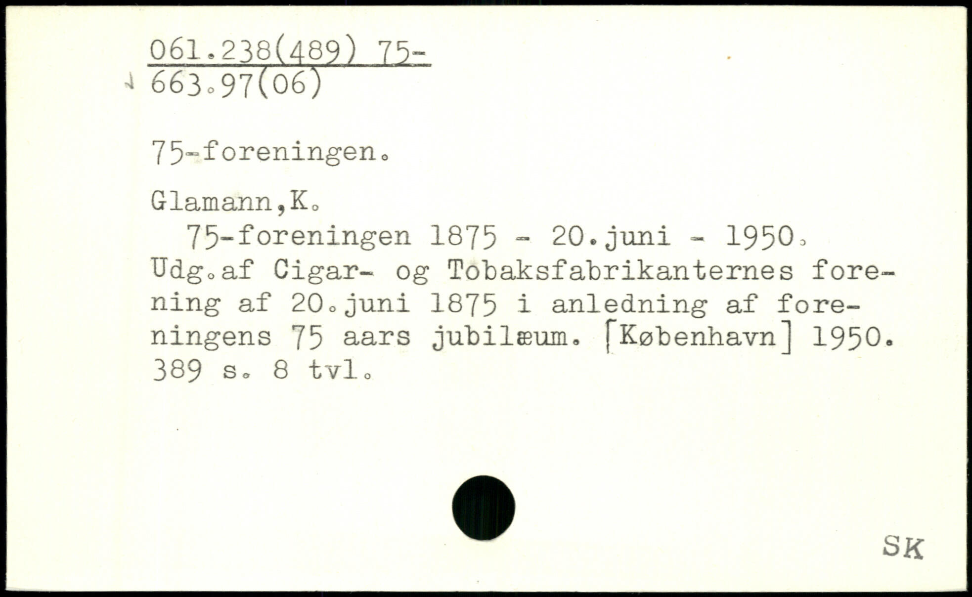 7 5-foreningen. Glamann,K0 75-foreningen 1875 - 20.juni - 195Ch Udg0af Cigar- og Tobaksfabrikanternes forening af 20.juni 1875 i anledning af foreningens 75 aars jubilæum.