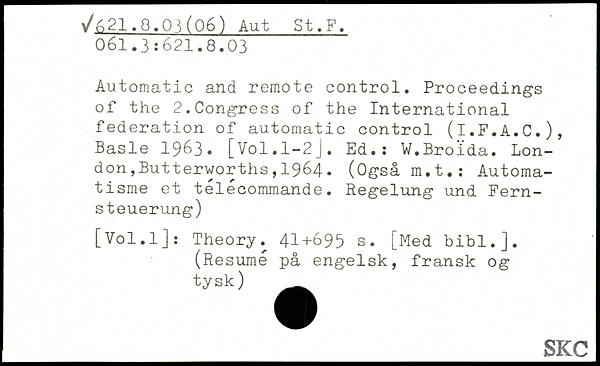 Automatic and remote control. Proceedings of the 2.Congress of the International federation of automatic control (I.F.A.C.), Basle 1963. [
